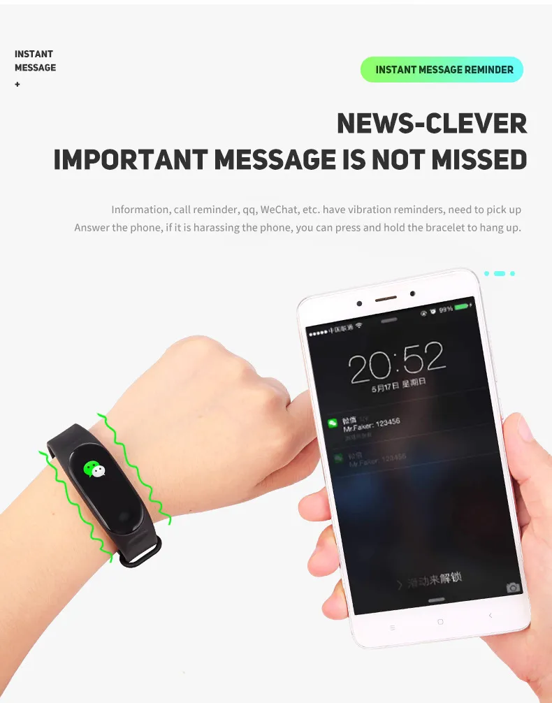 Equipped with Bluetooth connectivity, the M3 Smart Bracelet syncs effortlessly with your smartphone, allowing you to receive notifications for calls, messages, and app alerts directly on your wrist. Its user-friendly interface and customizable watch faces make it both functional and stylish, suitable for both casual wear and athletic endeavors.