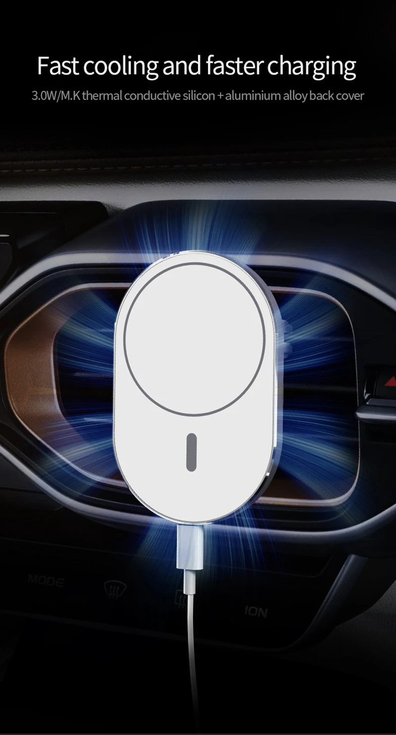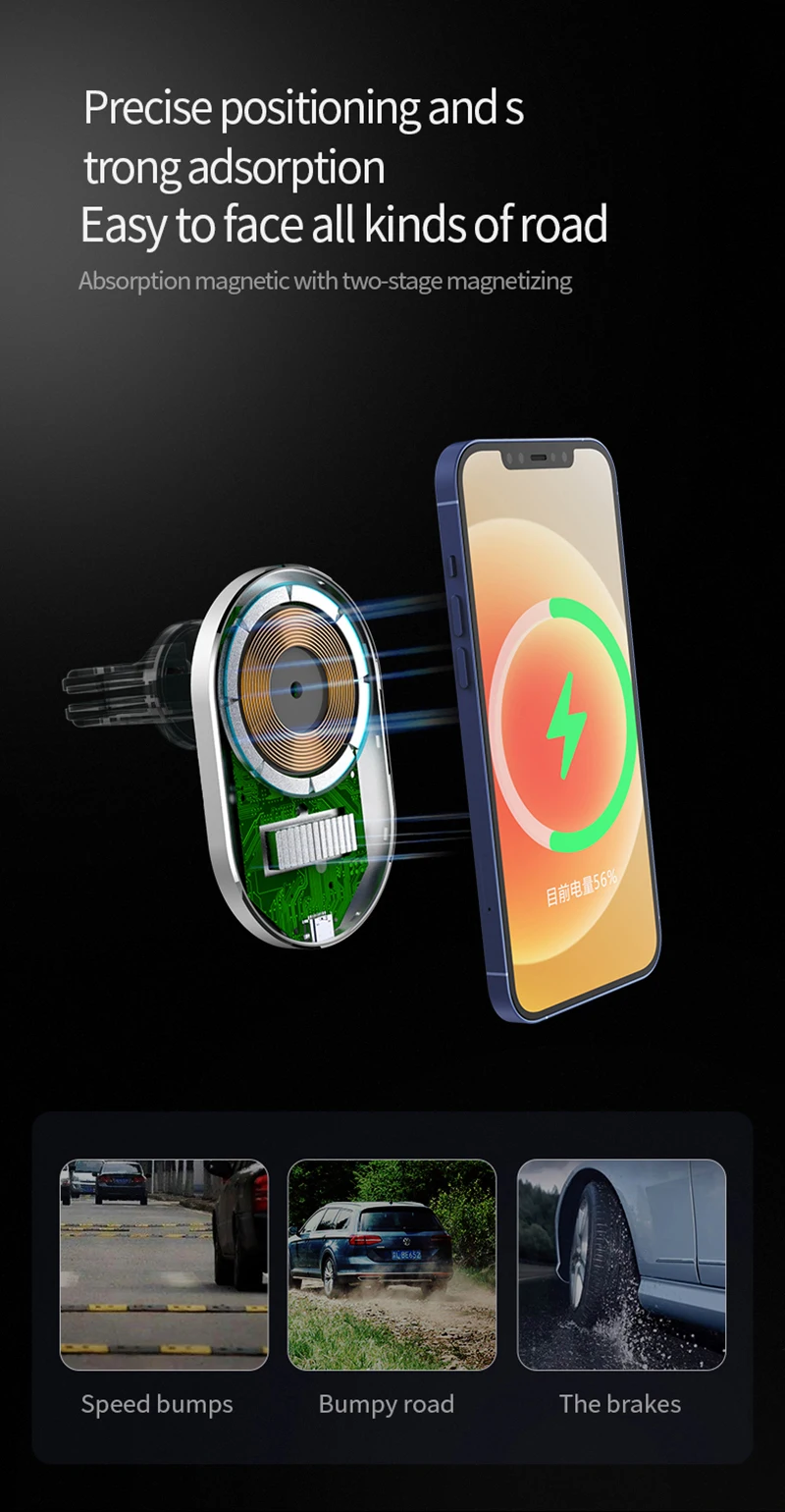 This car holder is designed to provide both secure mounting and fast wireless charging for your MagSafe-compatible iPhone. The 15W Qi wireless charger delivers fast and efficient power, significantly reducing charging time. The magnetic alignment ensures your phone is perfectly positioned for optimal charging efficiency. The holder supports a wide range of viewing angles, making it ideal for navigation and hands-free calls.