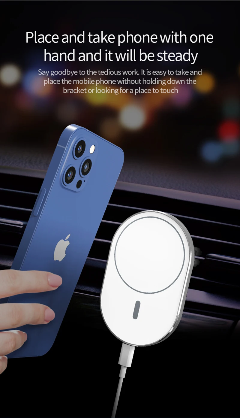 The Magnetic Cell Phone Car Holder for MagSafe iPhone 12, 13, 14, and 15 Pro Max is an essential accessory for anyone who needs reliable phone mounting and fast charging while driving. Its sleek design, strong magnetic hold, 15W fast wireless charging capabilities, and LED light indicator make it a perfect choice for iPhone users. Whether you’re on a long road trip or a short commute, this charger ensures your phone stays secure and fully charged, providing convenience and efficiency in one stylish package. Invest in the Magnetic Cell Phone Car Holder and experience the benefits of advanced charging technology on the go.