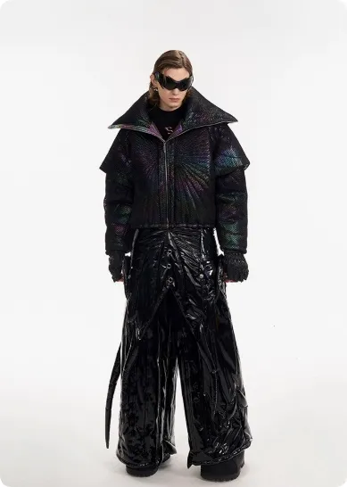 that evoke an alien-like vibe. The asymmetrical cuts and edgy stitching patterns give it a sleek, avant-garde appearance, perfect for making