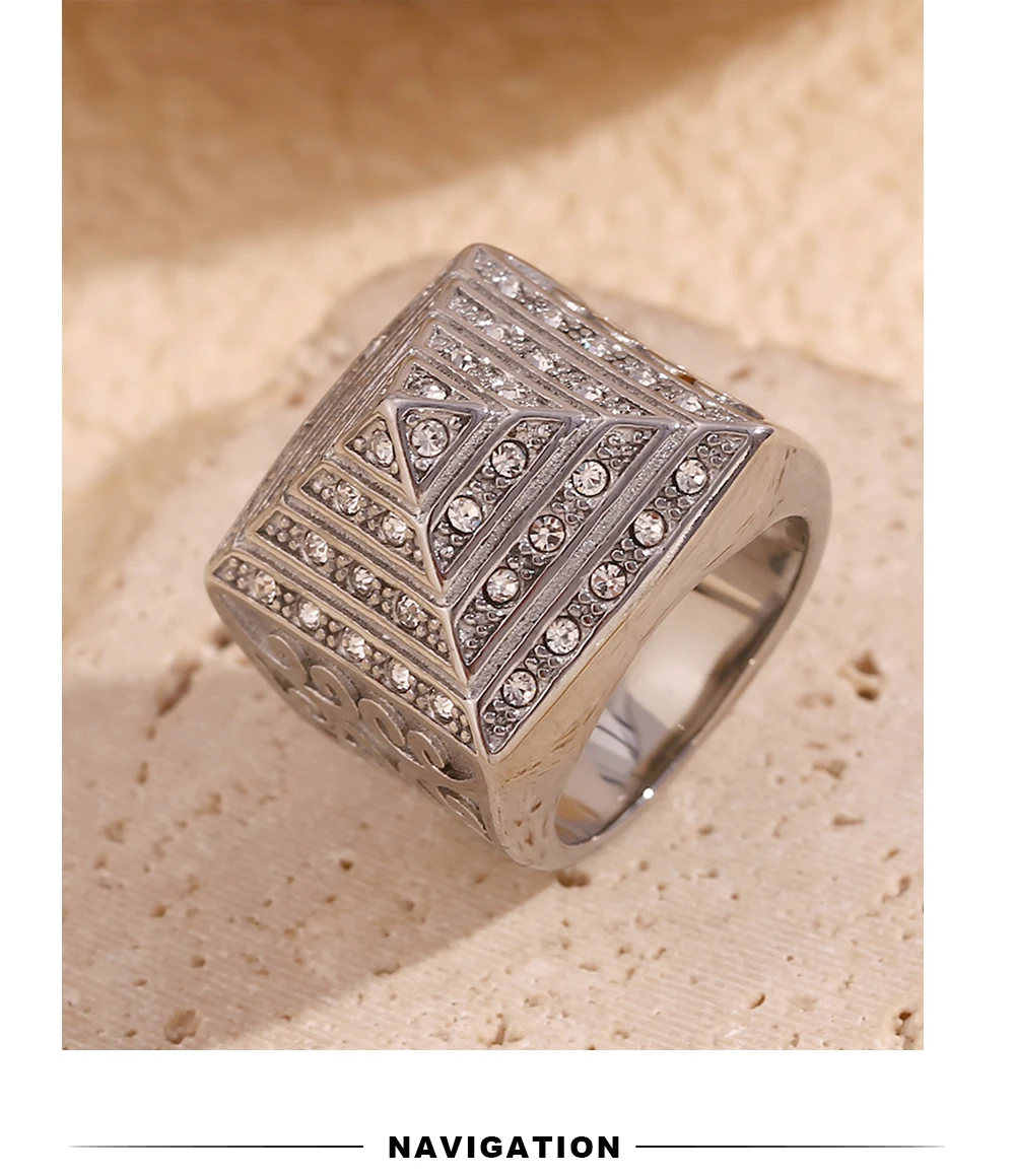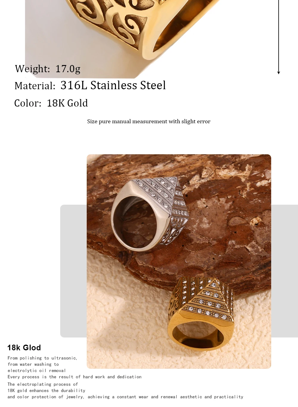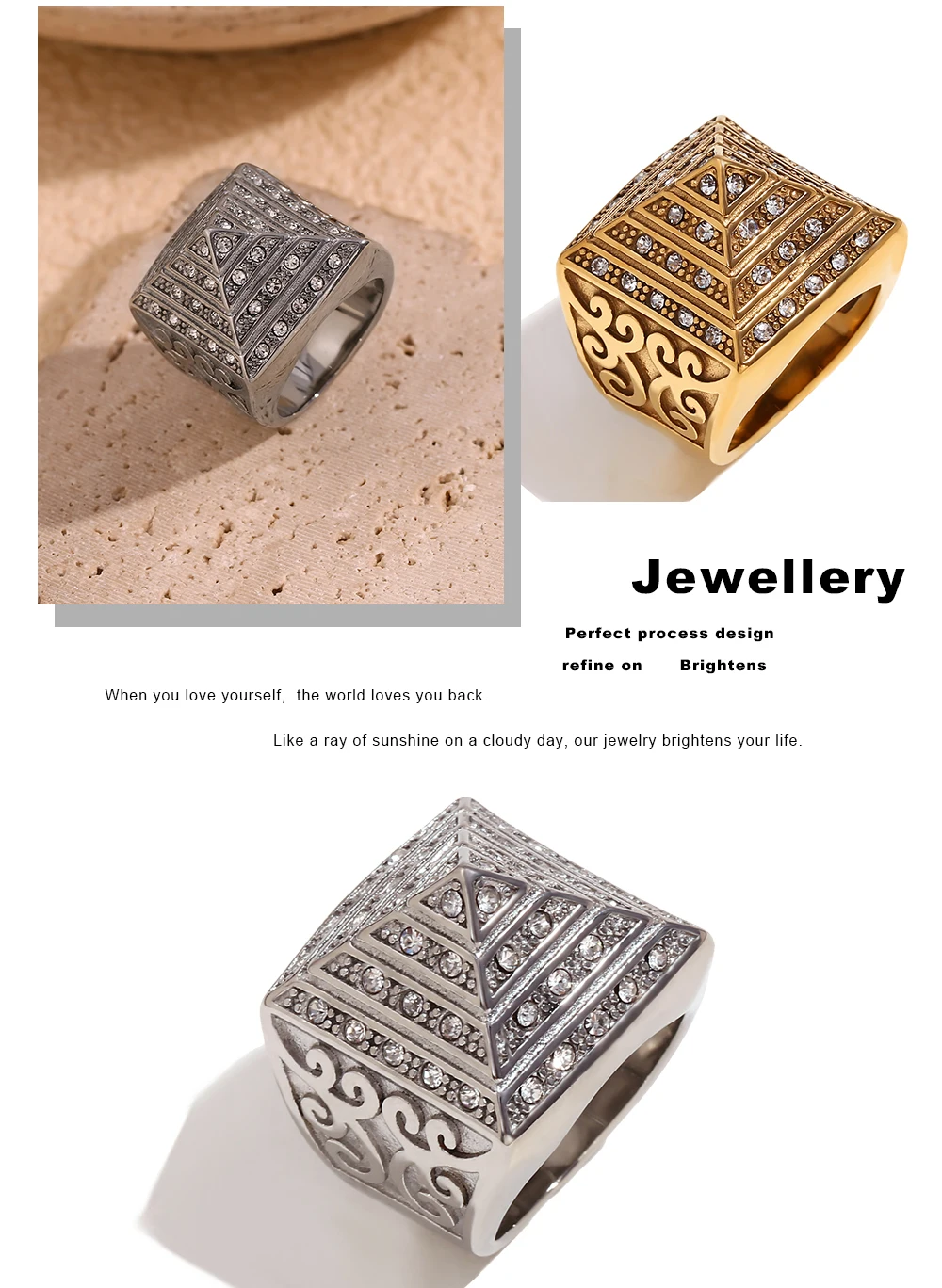 The MamacitaSlay New In Vintage Four Story Pyramid Vine Waterproof Men’s Ring offers a distinctive blend of vintage elegance, architectural inspiration, and practical durability. Crafted from high-quality stainless steel, this waterproof ring is designed to withstand the rigors of daily life while making a bold fashion statement.