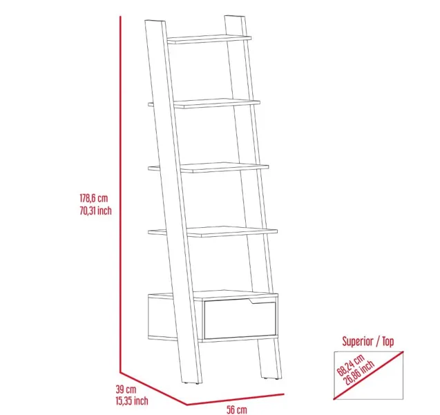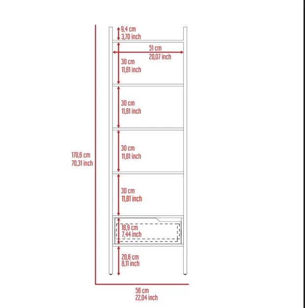Oslo trapezoidal bookshelf, four legs, one drawer, five open shelves - deep walnut wood