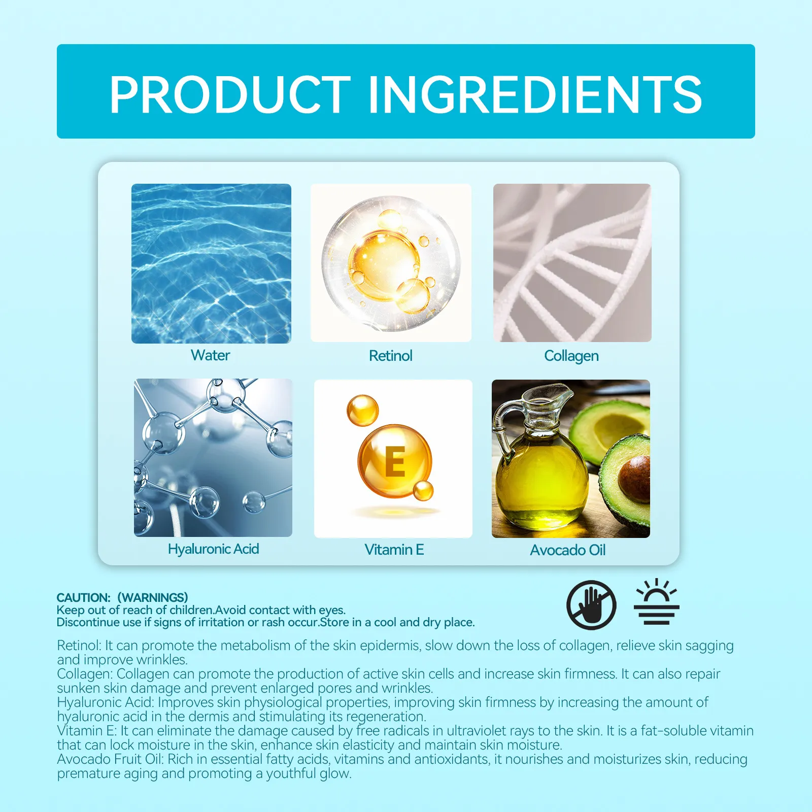 Ingredients: Water, retinol, collagen, hyaluronic acid, vitamin E, avocado fruit oil