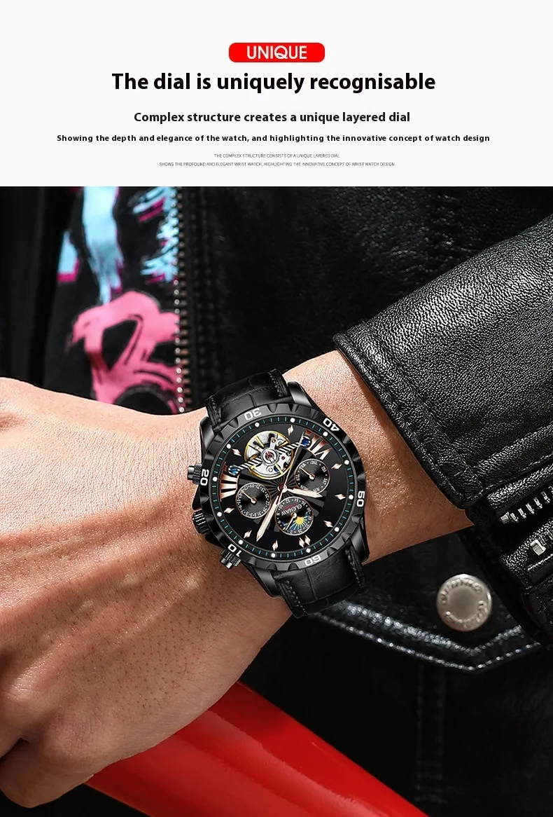 One of the standout features of this watch is its hollowed-out dial. The transparent design allows you to view the movement of the watch’s internal mechanics, offering a captivating visual experience. The intricate design of the gears and springs adds a level of sophistication and technical appeal, making this timepiece not only functional but also a conversation starter.