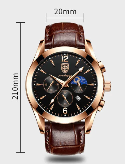 The genuine leather strap offers both comfort and style. It’s soft on the wrist, adjustable, and provides a secure fit throughout the day. The classic leather design ensures that the watch looks great with any outfit, whether casual or formal.