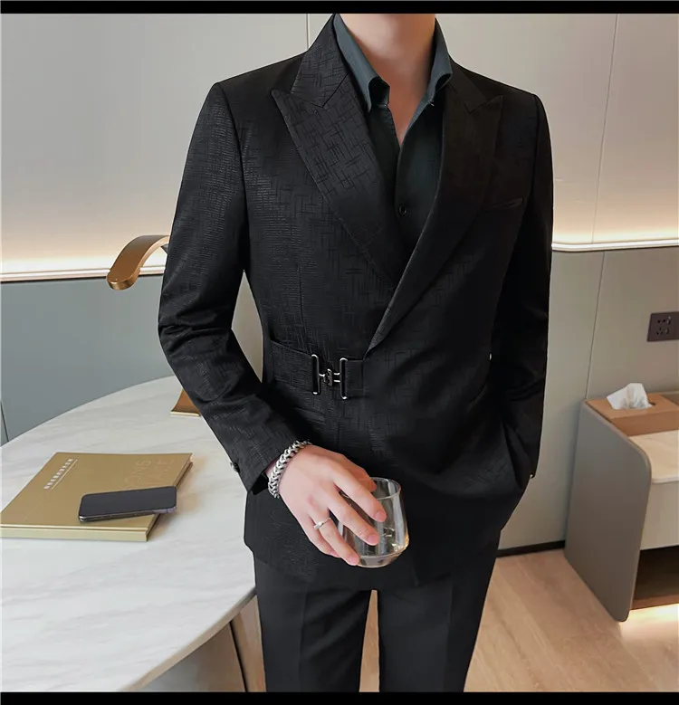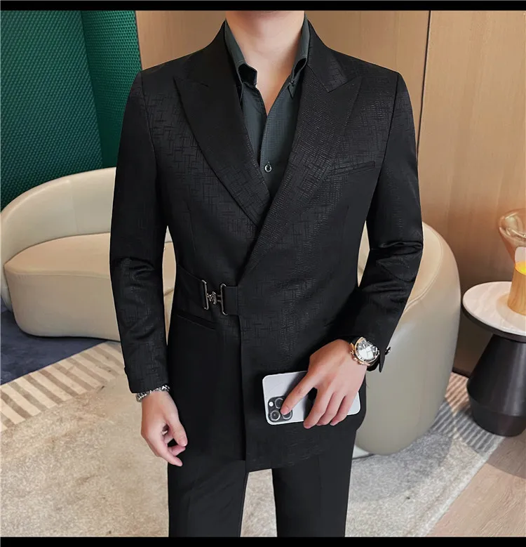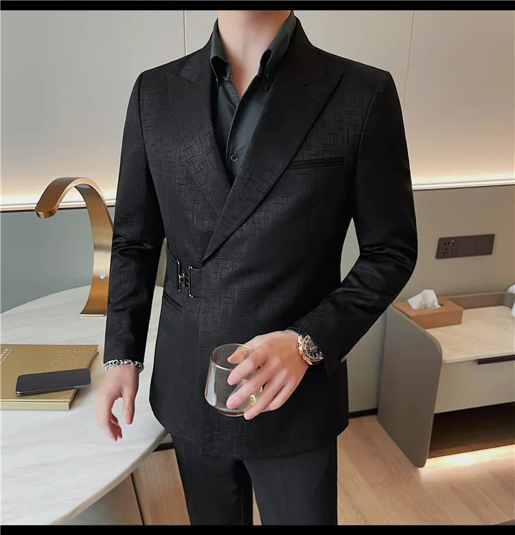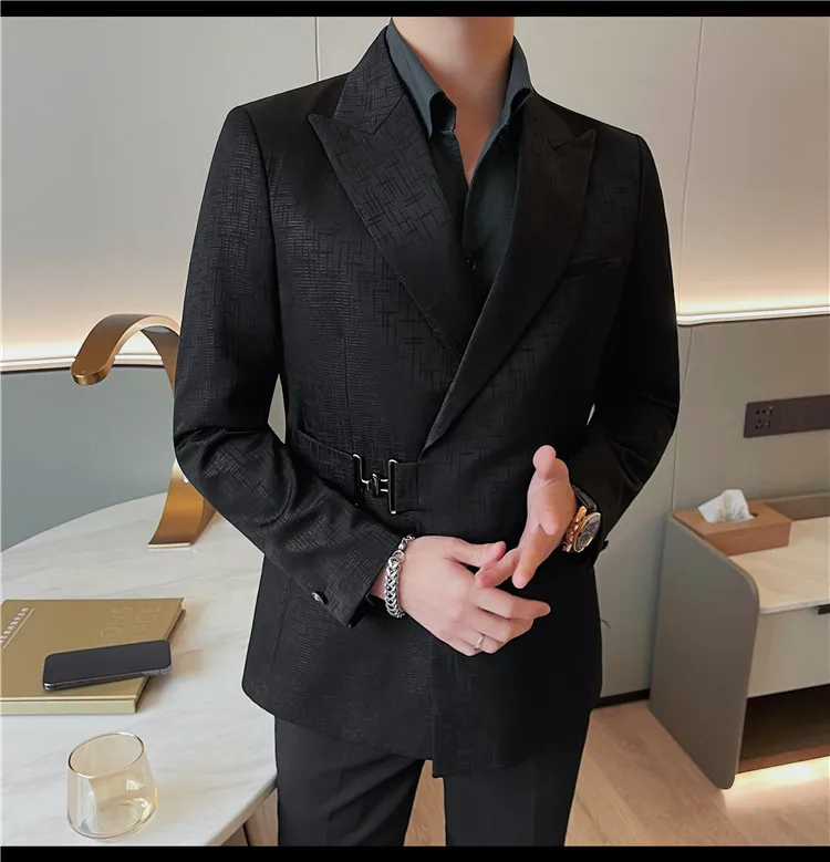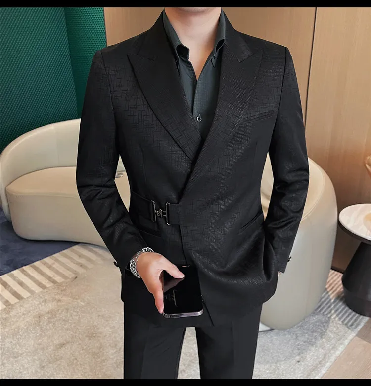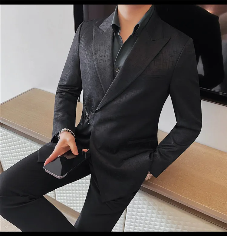 The Men's Suit Metal Buckle Design Gun Collar Jacket is a must-have for anyone looking to make a statement with their formal attire. Its bold design, coupled with the high-quality fabric and tailored fit, provides the perfect blend of style, comfort, and sophistication. Whether you're attending a corporate event, a social gathering, or a formal dinner, this jacket ensures that you look sharp and stylish. Elevate your wardrobe with this unique piece and embrace a fresh take on traditional men's fashion.