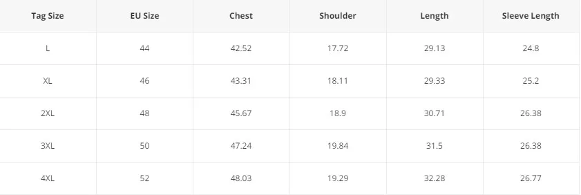 | Size | 175/L | 180/XL | 185/2XL | 190/3XL | 195/4XL |