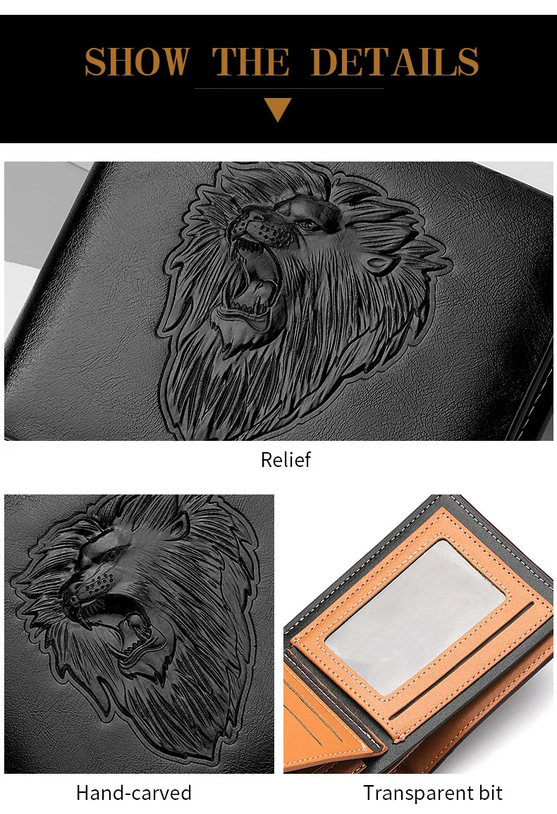 The wallet's sleek and compact design makes it ideal for everyday use, whether you're heading to work, traveling, or enjoying a night out. The bold lion embossing pairs well with both casual and formal outfits, making it a versatile addition to any wardrobe. With its sophisticated appearance and practical functionality, this wallet is perfect for the modern man.