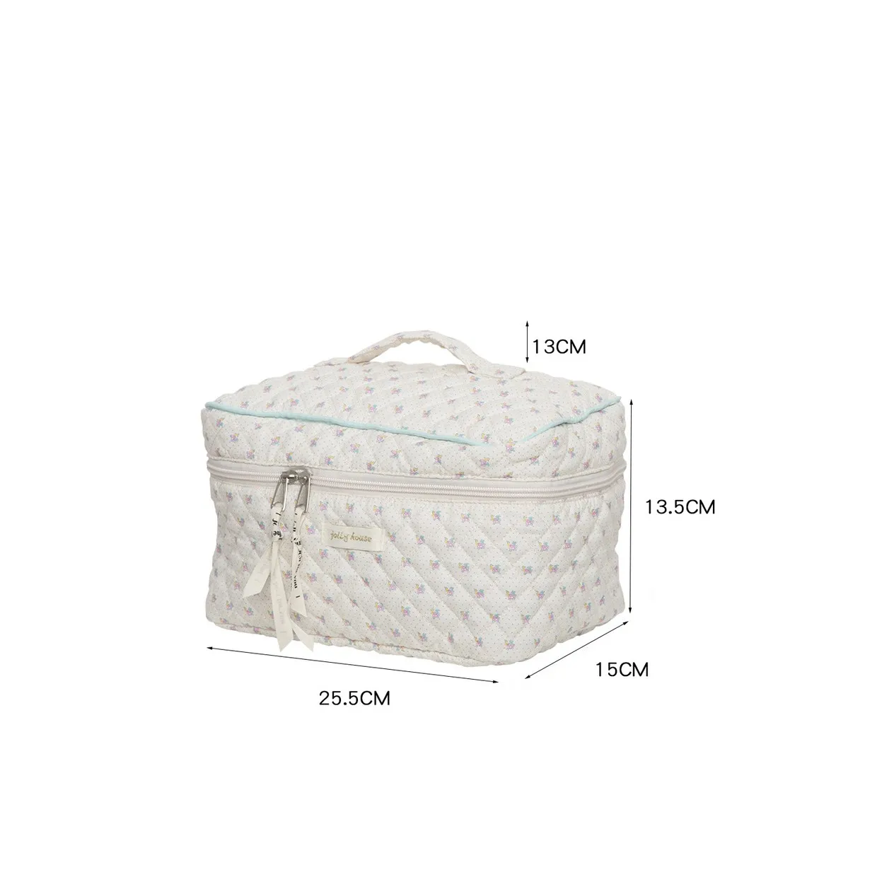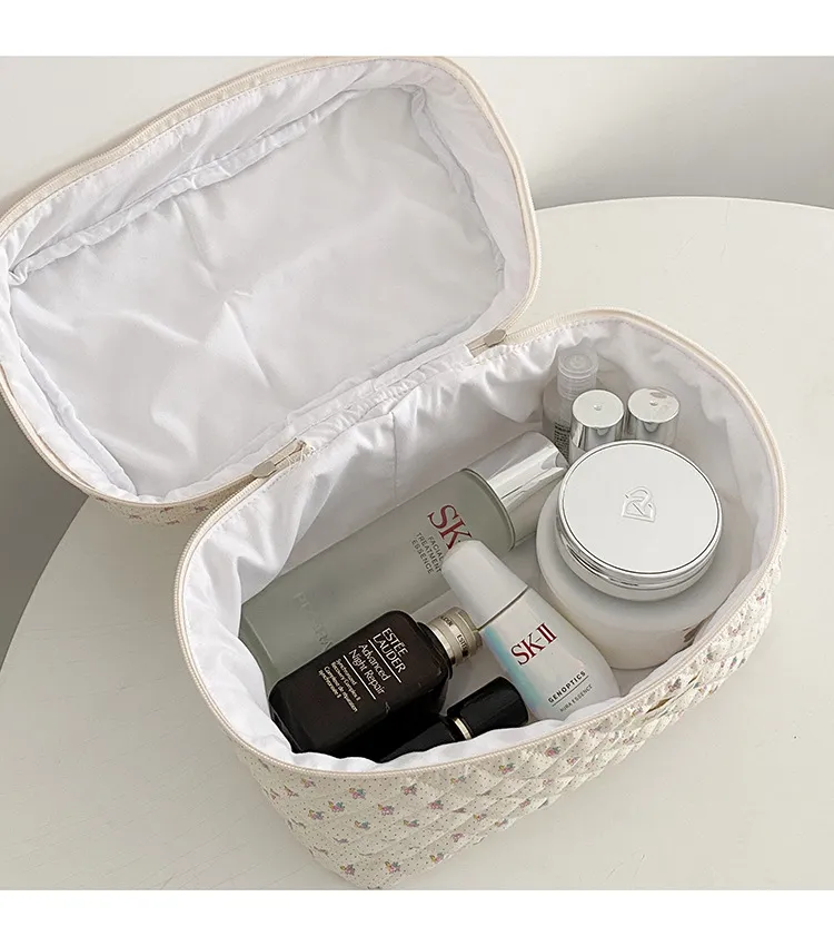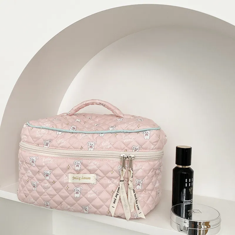 Color: white cherry flap cosmetic bag, pink bunny flap cosmetic bag, beige floral flap cosmetic bag