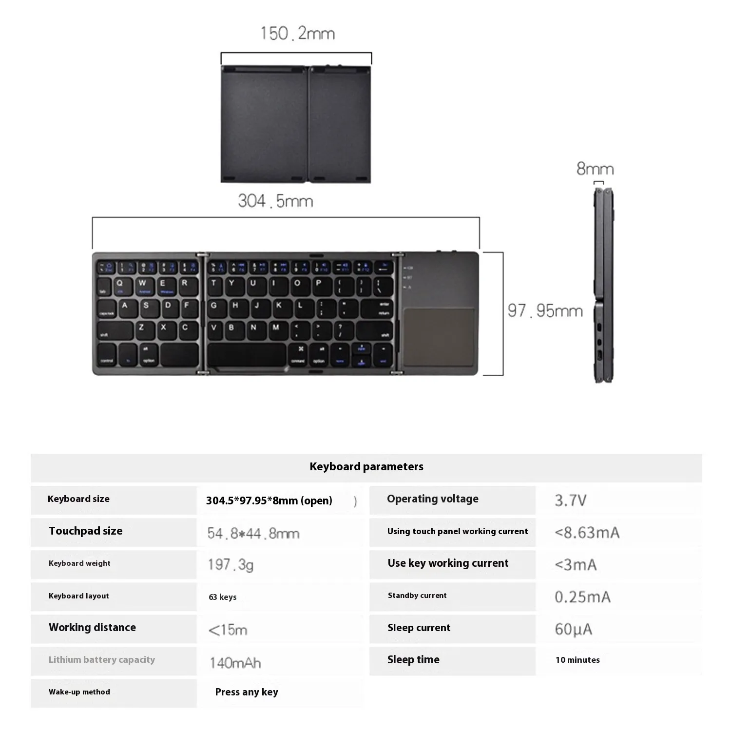 The Mini Tri-fold Bluetooth Keyboard Portable Thin Touch is a compact and stylish solution for those who need a highly portable and efficient typing tool while on the go. Its tri-fold design allows it to fit into even the smallest bags or backpacks, making it the perfect keyboard for travelers, professionals, or anyone who frequently works remotely. With Bluetooth connectivity, a touch-sensitive typing surface, and a thin profile, this keyboard is designed to offer maximum convenience and comfort in a portable format.