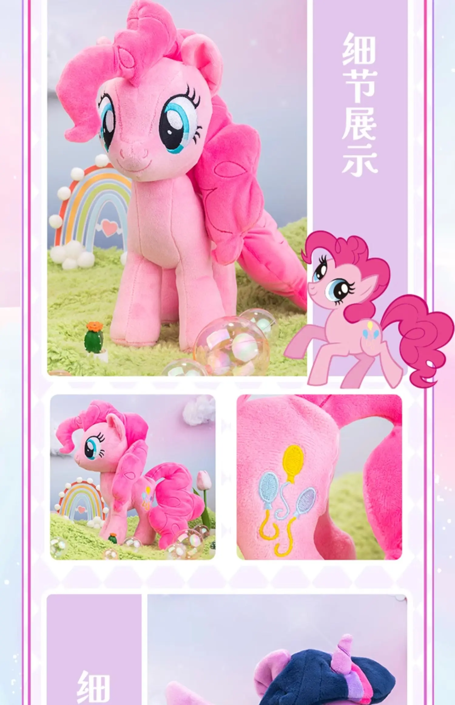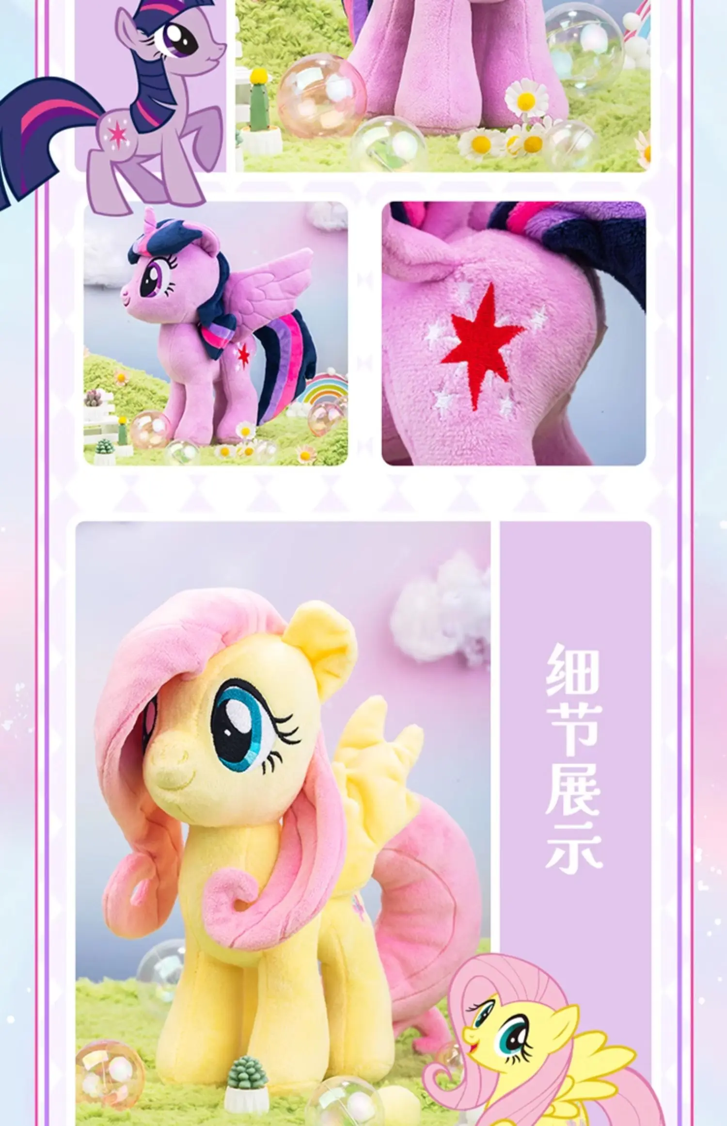 - Design: The plush dolls showcase the popular My Little Pony characters Pinkie Pie and Fluttershy, each crafted with detailed embroidery and vibrant colors. The dolls capture the unique personality and charm of each pony, making them instantly recognizable and beloved by fans.