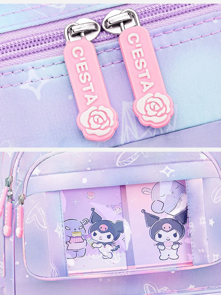 The backpack showcases an endearing Kuromi design, known for its playful and edgy personality. The front of the bag features a vibrant print of Kuromi, complemented by additional decorative elements that add to its whimsical appeal. The backpack is crafted in a soft, pastel color palette, which is both trendy and versatile. The overall design combines both aesthetic appeal and functionality, making it a standout choice for young students.