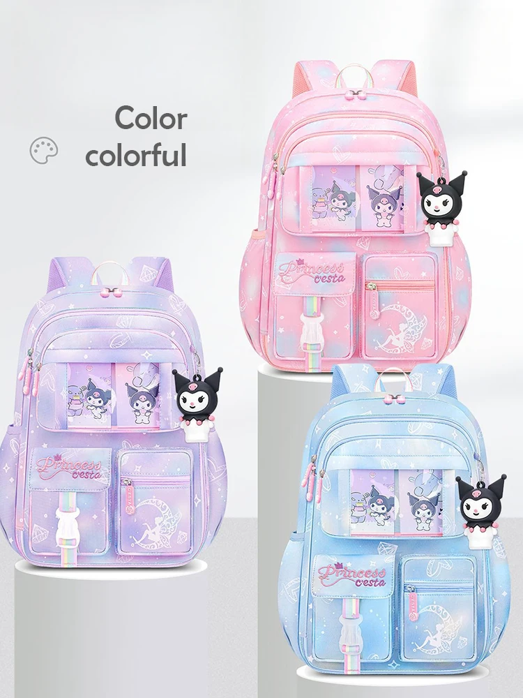 The MINISO Sanrio Kuromi Student Backpack is a delightful fusion of charm and practicality. Designed for young students, this kawaii backpack features the beloved Sanrio character Kuromi, bringing both style and comfort to school. Perfect for girls who adore cute cartoon characters, this backpack is not only fashionable but also thoughtfully designed to protect growing spines and reduce carrying burdens.