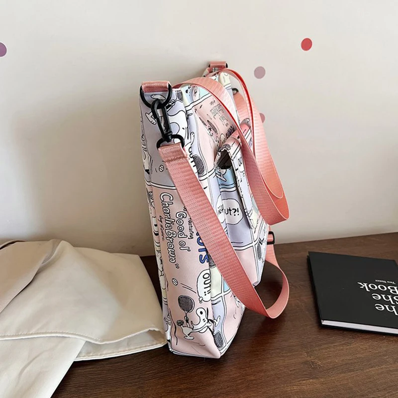 MINISO Snoopy Cartoon Print Tote Bag Fashionable Large Capacity Casual One Shoulder Crossbody Bag, Nylon Pink Handbag