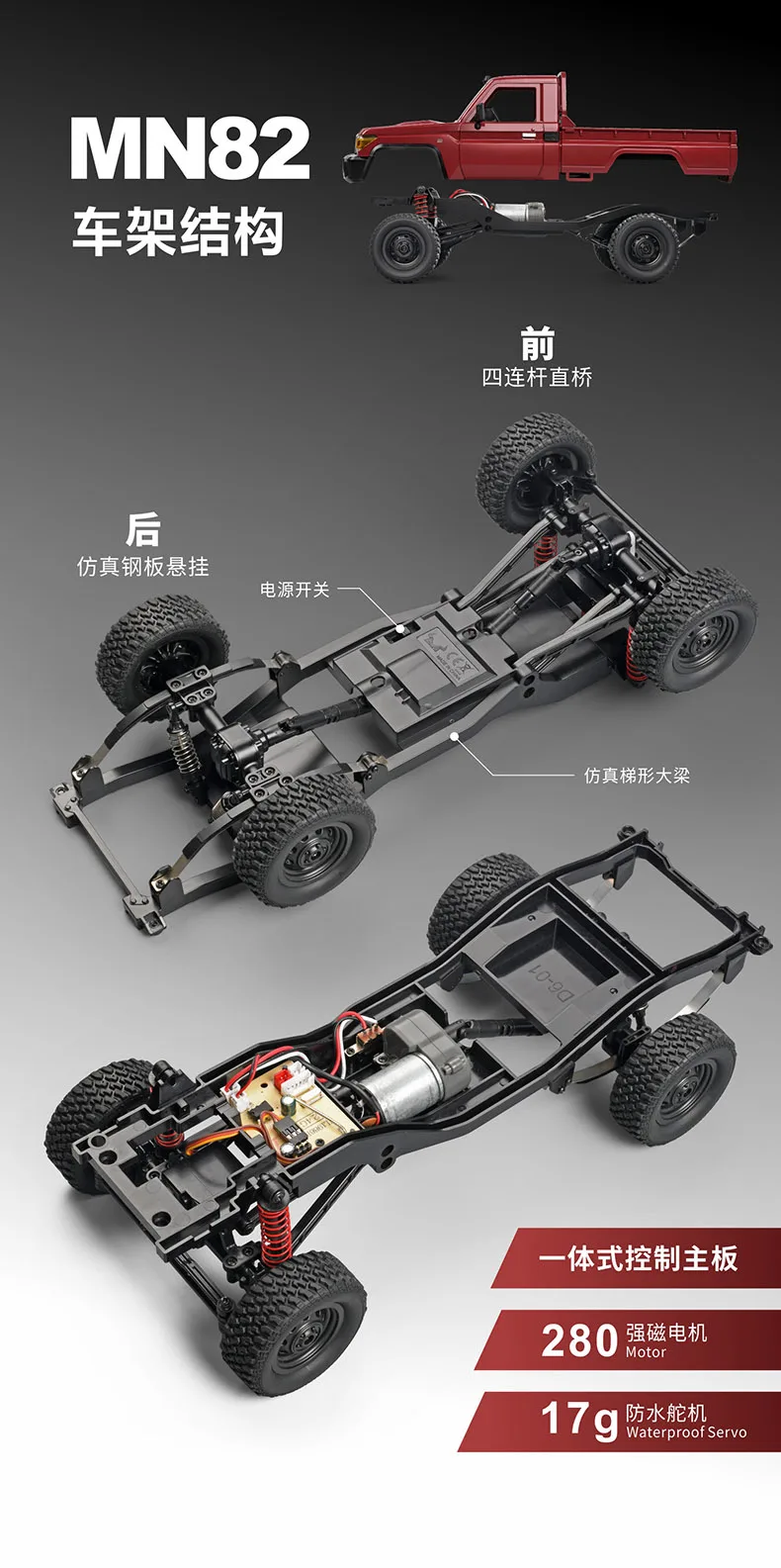 Equipped with a 4-wheel drive (4WD) system, the MN82 can easily tackle challenging terrains such as dirt, sand, gravel, and rocky surfaces. The powerful drivetrain ensures that the truck remains stable and responsive, even on uneven or rugged paths.