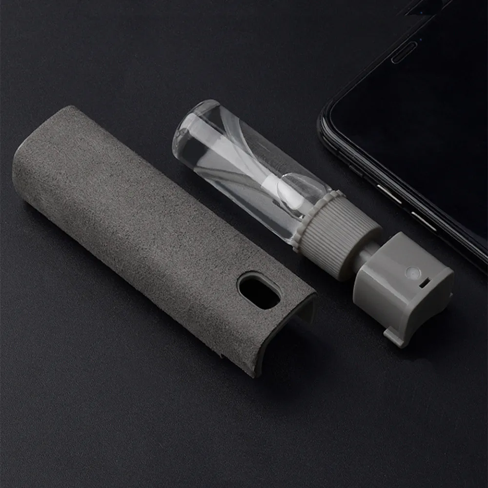 microfiber wipe and internal bottle into one slim and portable item. The microfiber body is washable and a clear cover for the spray is