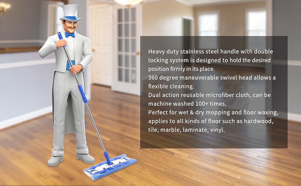 - DURABLE CONSTRUCTION - Built with durable plastic and sturdy stainless steel handle, inlcudes 3 reusable microfiber cloths and 1 dirt removal scrubber, applies to all kinds of floor such as hardwood, tile, marble, laminate, vinyl, make boring chore of cleaning your floors easy and effortless