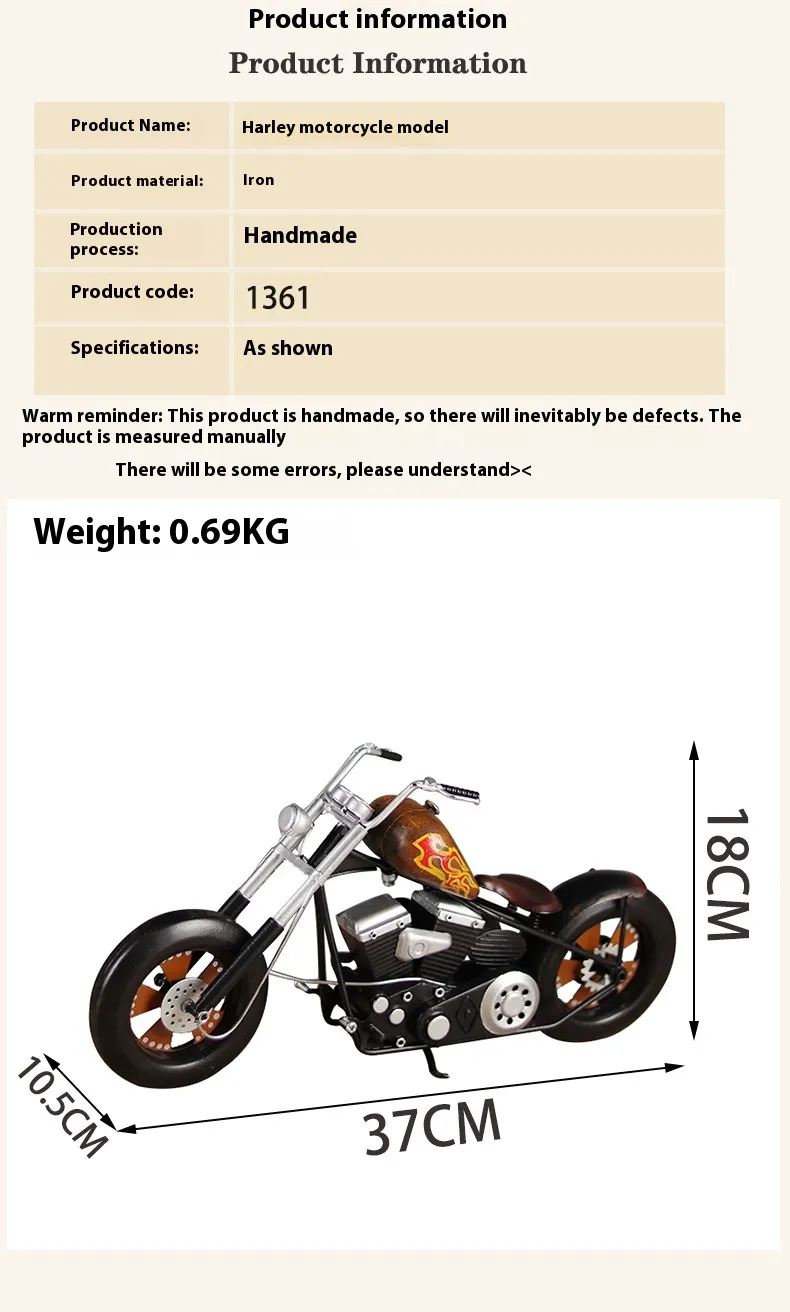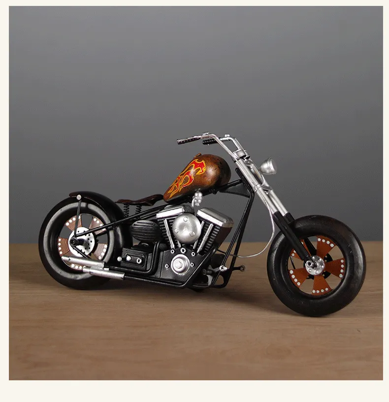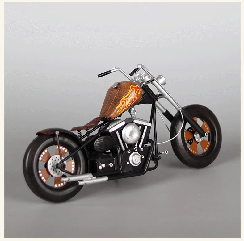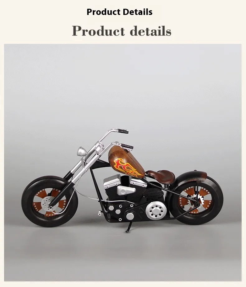 This metal motorcycle model is crafted with incredible attention to detail, from the wheels and handlebars to the engine and exhaust pipes. Every component is thoughtfully designed to mimic the features of classic motorcycles, giving the model a realistic look that vintage enthusiasts will love. The handmade metalwork adds a level of artistry that makes this model a true piece of craftsmanship.