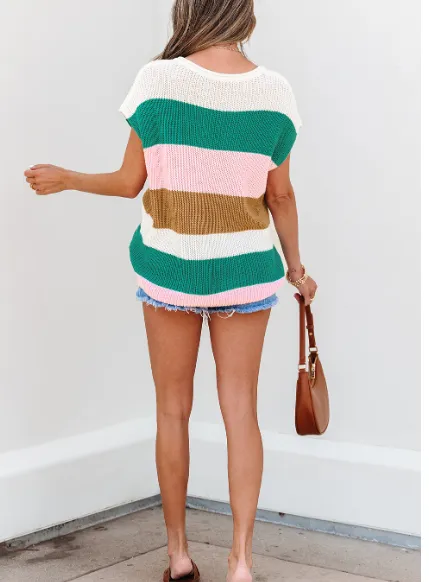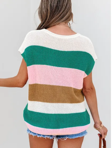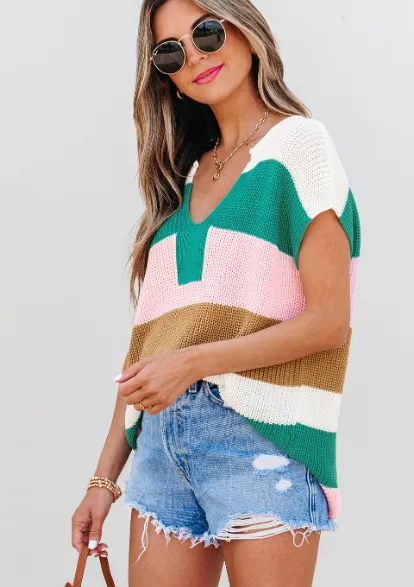 Multicolour Color Block Notch V Neck Sweater T-Shirt