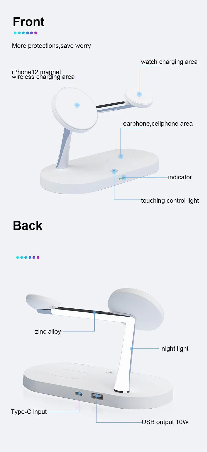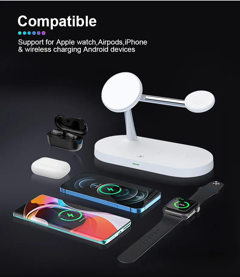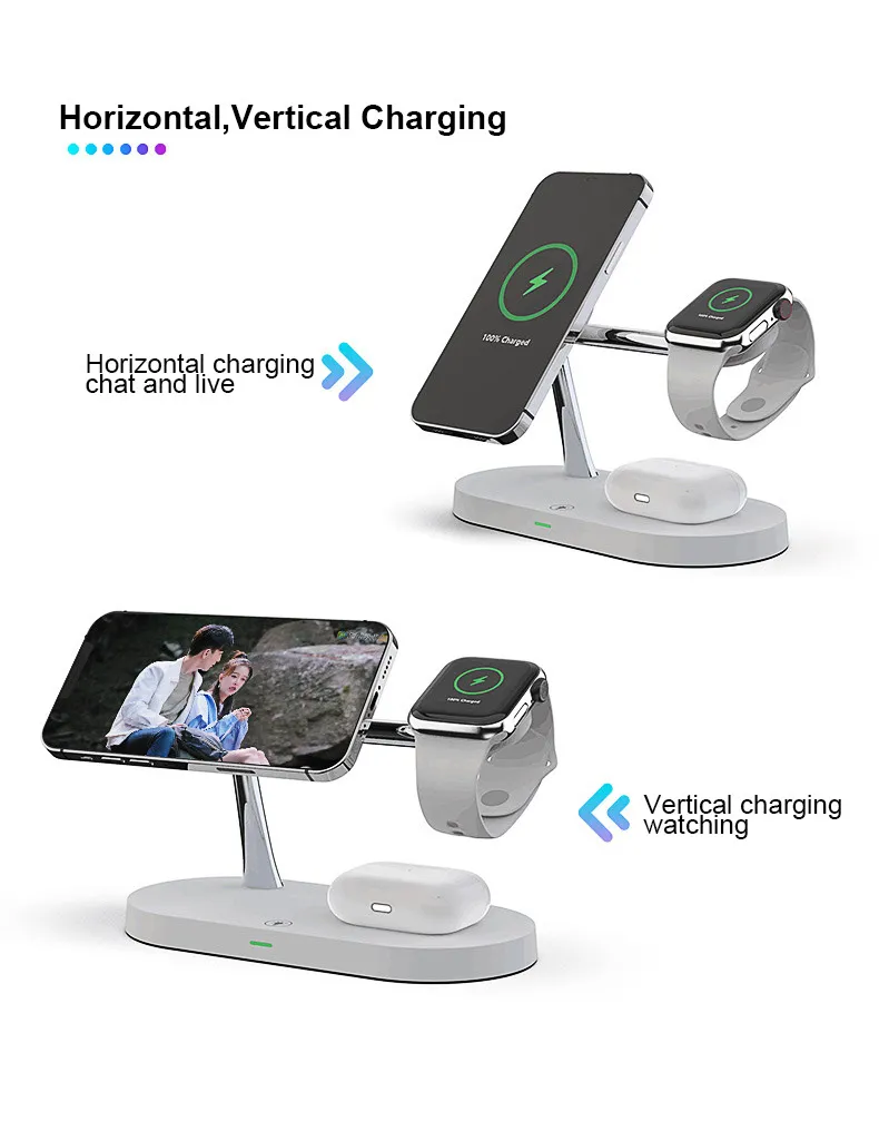 This versatile charging station features magnetic alignment for effortless placement, an adjustable desktop phone holder, and a sleek, compact design that fits seamlessly into your home or office setup. Whether you're a tech enthusiast, a busy professional, or someone who simply values convenience, this 5-in-1 wireless charger provides the ultimate charging experience.