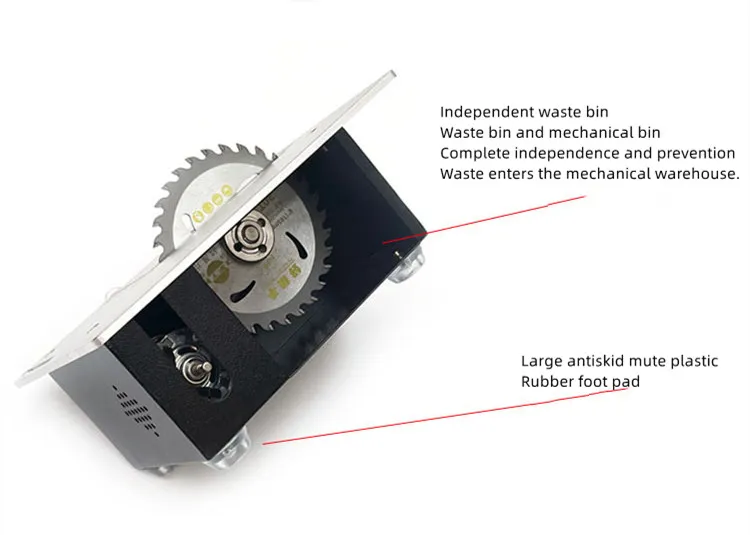 The saw features an adjustable cutting depth and angle, allowing you to tailor cuts to exact specifications. With a stable, anti-slip base and safety guards, this table saw is designed to keep the material steady and protect the user, making it safe for continuous use. The multifunctional saw also comes with a set of replaceable blades, allowing you to switch between cutting tasks effortlessly. Additionally, the dust collection port helps maintain a clean workspace, reducing airborne particles and keeping visibility clear.