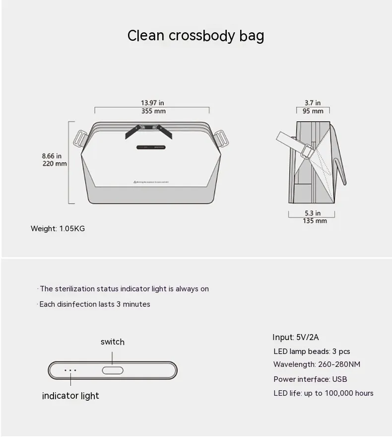 Introducing the Multifunctional UV Sterilization Shoulder Bag, designed for the modern individual who values hygiene and convenience. This