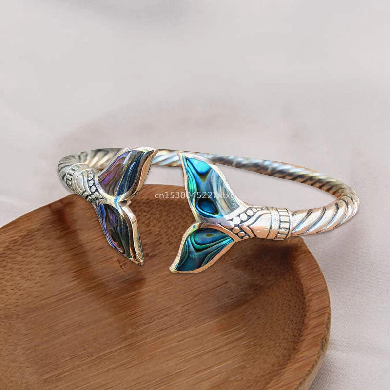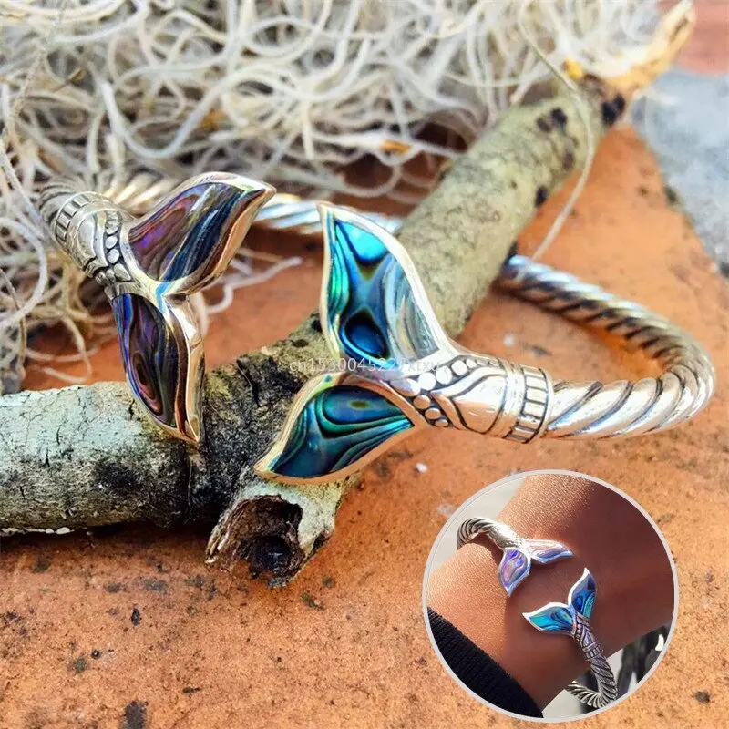 Dive into the enchanting beauty of the ocean with the Mystic Whale Tail Bracelet, a mesmerizing piece of jewelry that captures the elegance and grace of the majestic whale. This bracelet features intricately designed whale tail motifs at both ends, adorned with iridescent abalone shell inlays that shimmer with every movement, reflecting the vibrant colors of the sea.