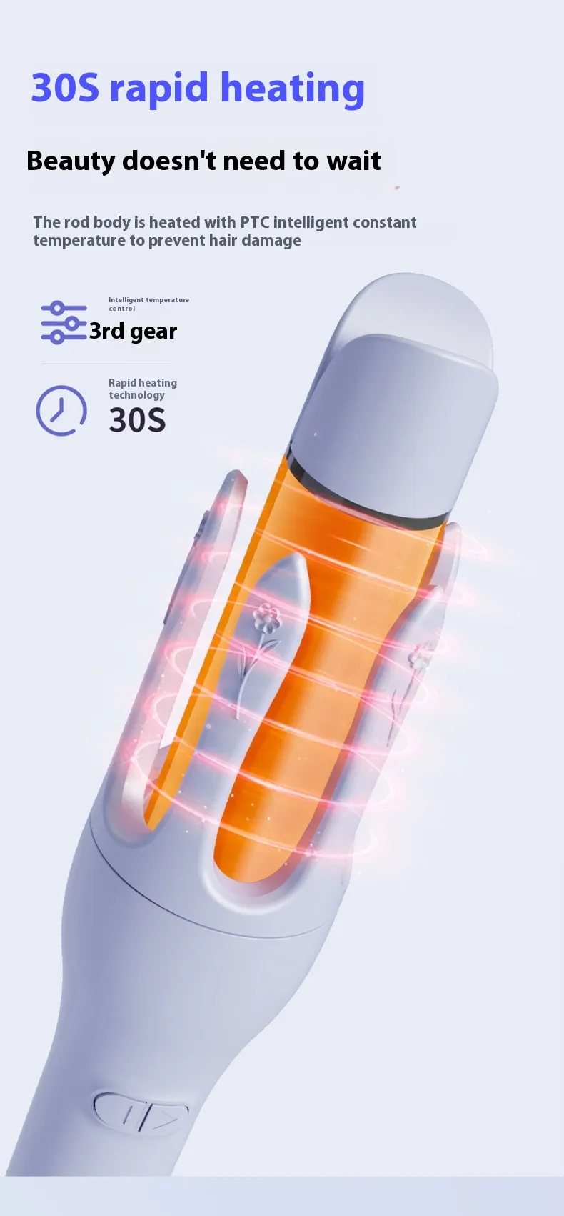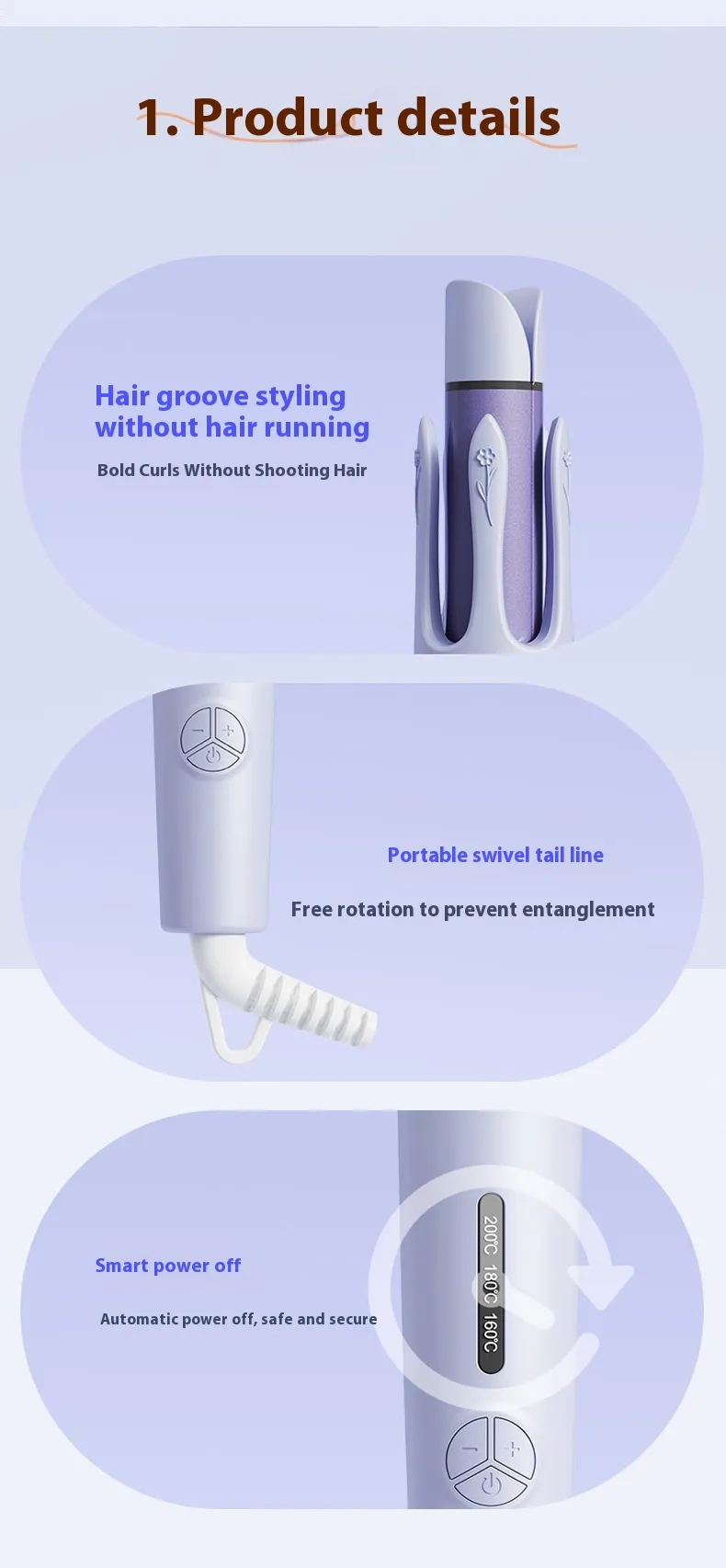Our curling iron auto-rotate features a rotating anti-scald design that prevents burns and ensures safe use. This curling iron auto-rotate also features an auto shut-off function that adds extra protection during 30 minutes of inactivity.
