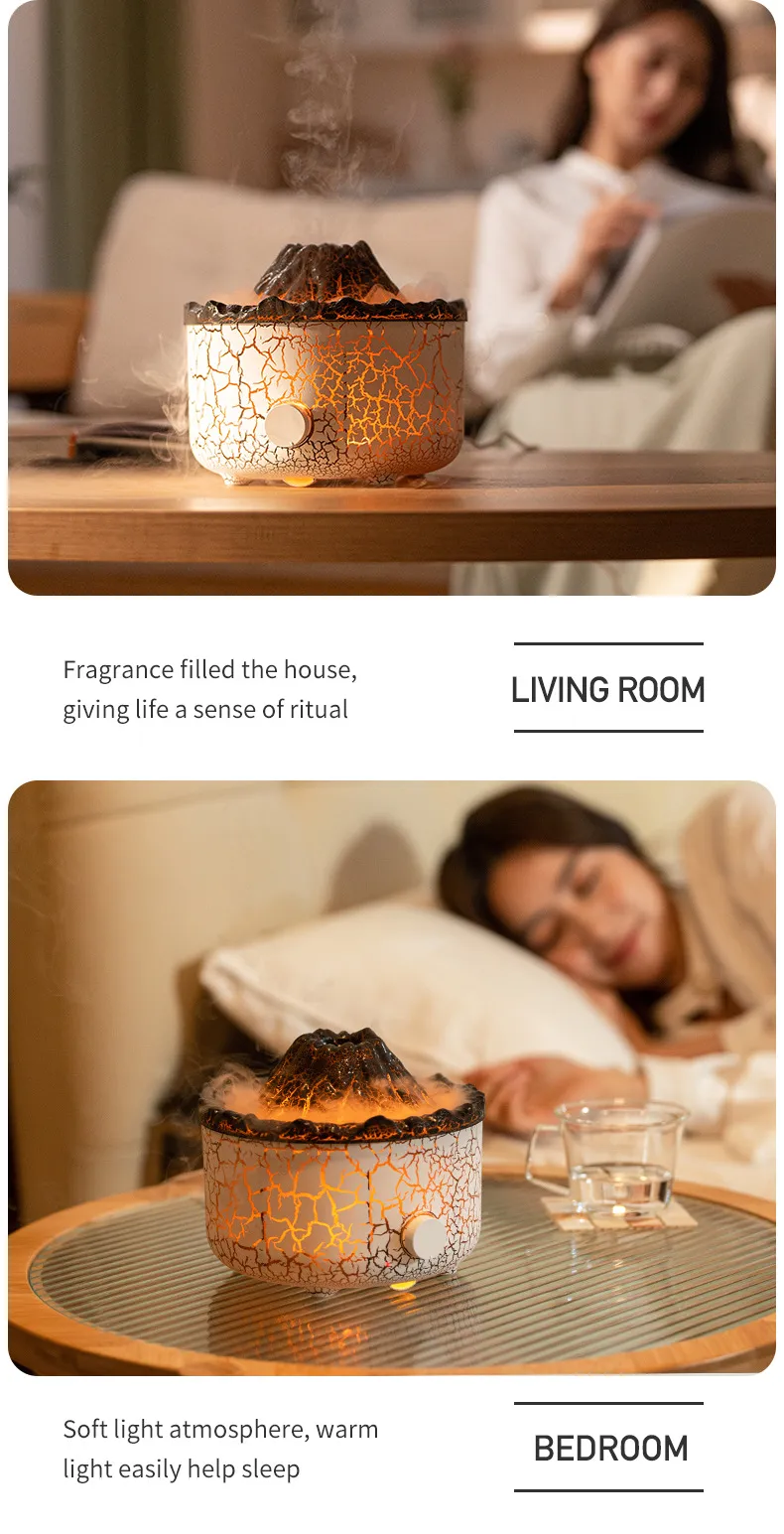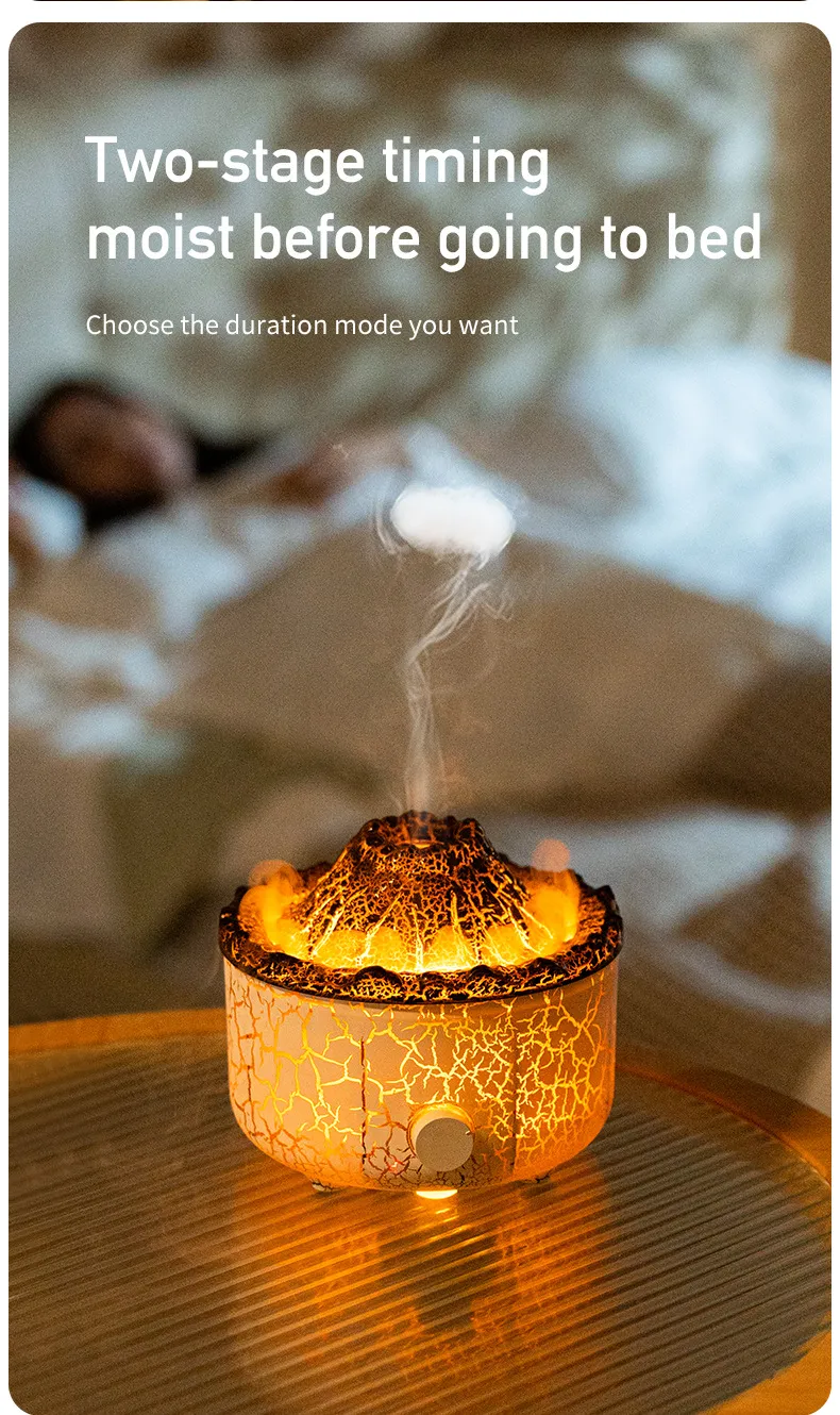 - The Volcano Humidifier features a dynamic Jellyfish Air Flame effect that simulates the movement of jellyfish in the water, creating a relaxing, otherworldly visual experience. This feature not only looks beautiful but also adds a calming element to any room.