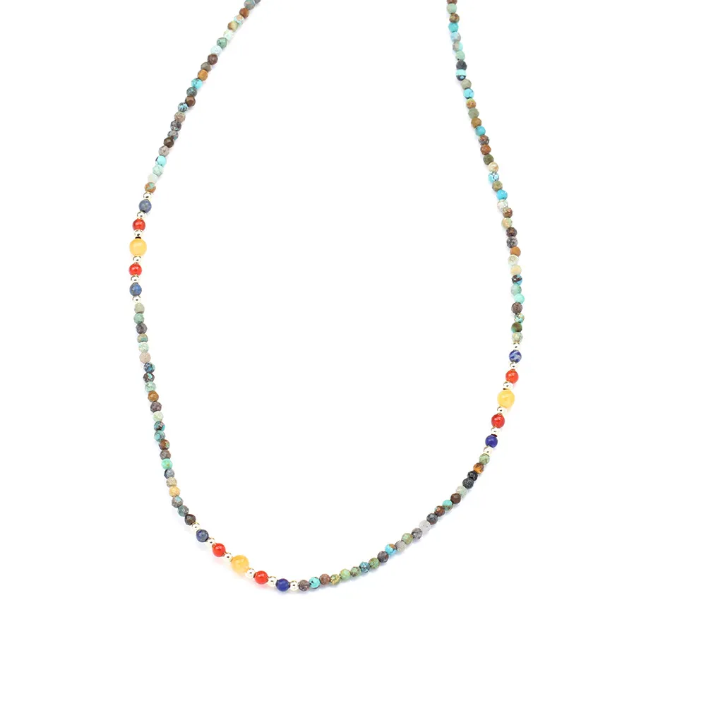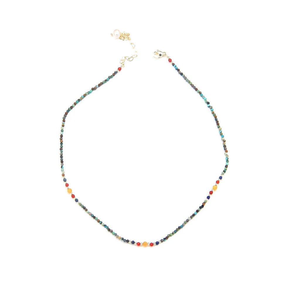 The colourful beads surrounding the pearl pendant add a playful and vibrant pop of color to the design. Their eclectic mix of hues creates an eye-catching contrast against the pearl, giving the necklace a youthful and fun, bohemian-inspired feel.