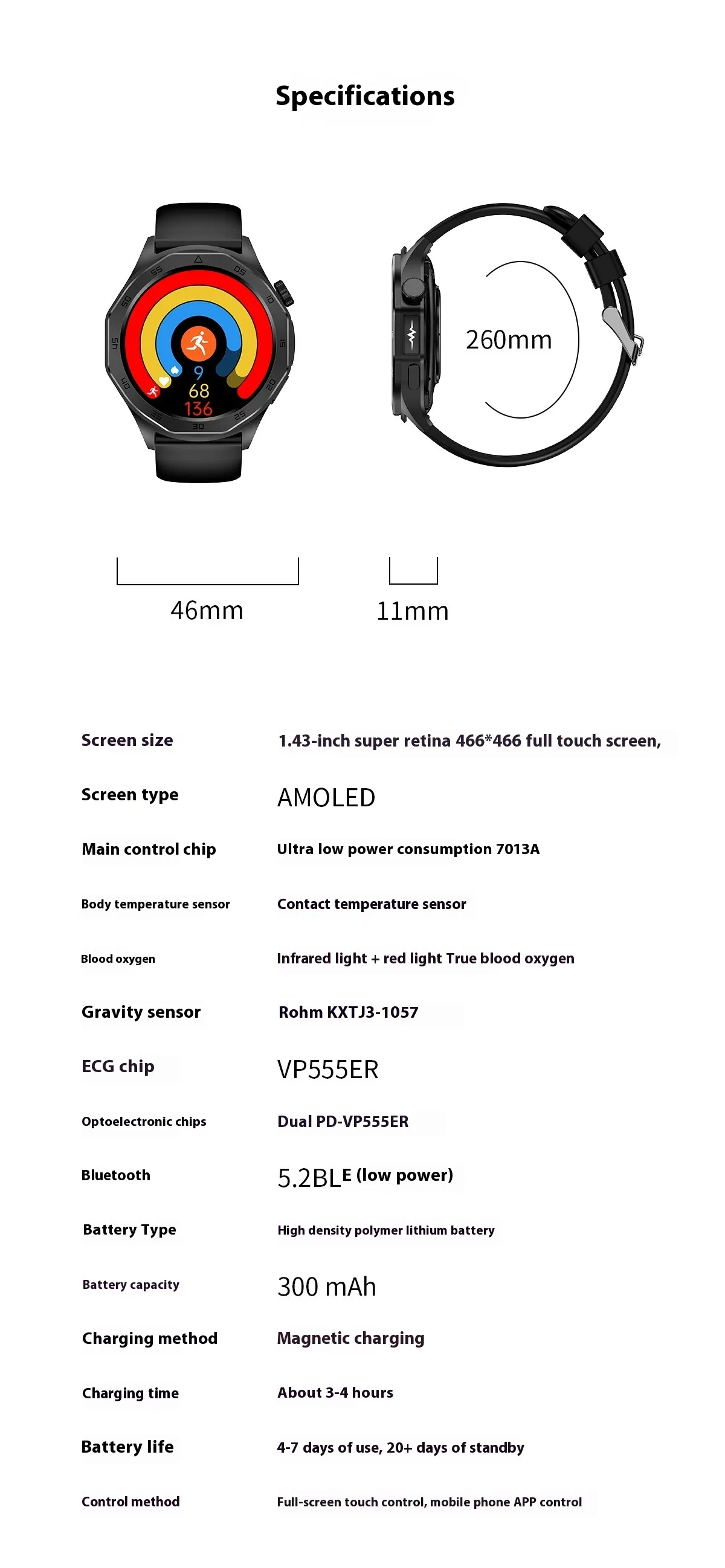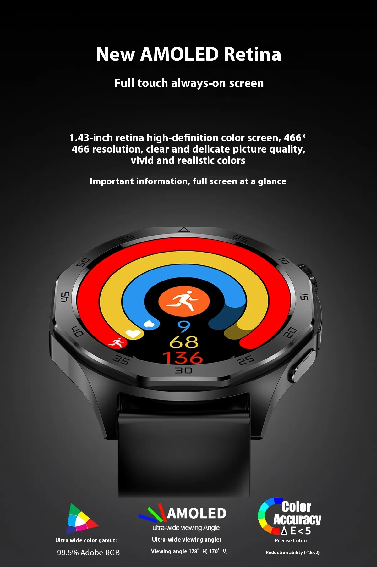- 1.43-inch AMOLED Display: Provides vibrant, high-resolution visuals for easy navigation and clarity.