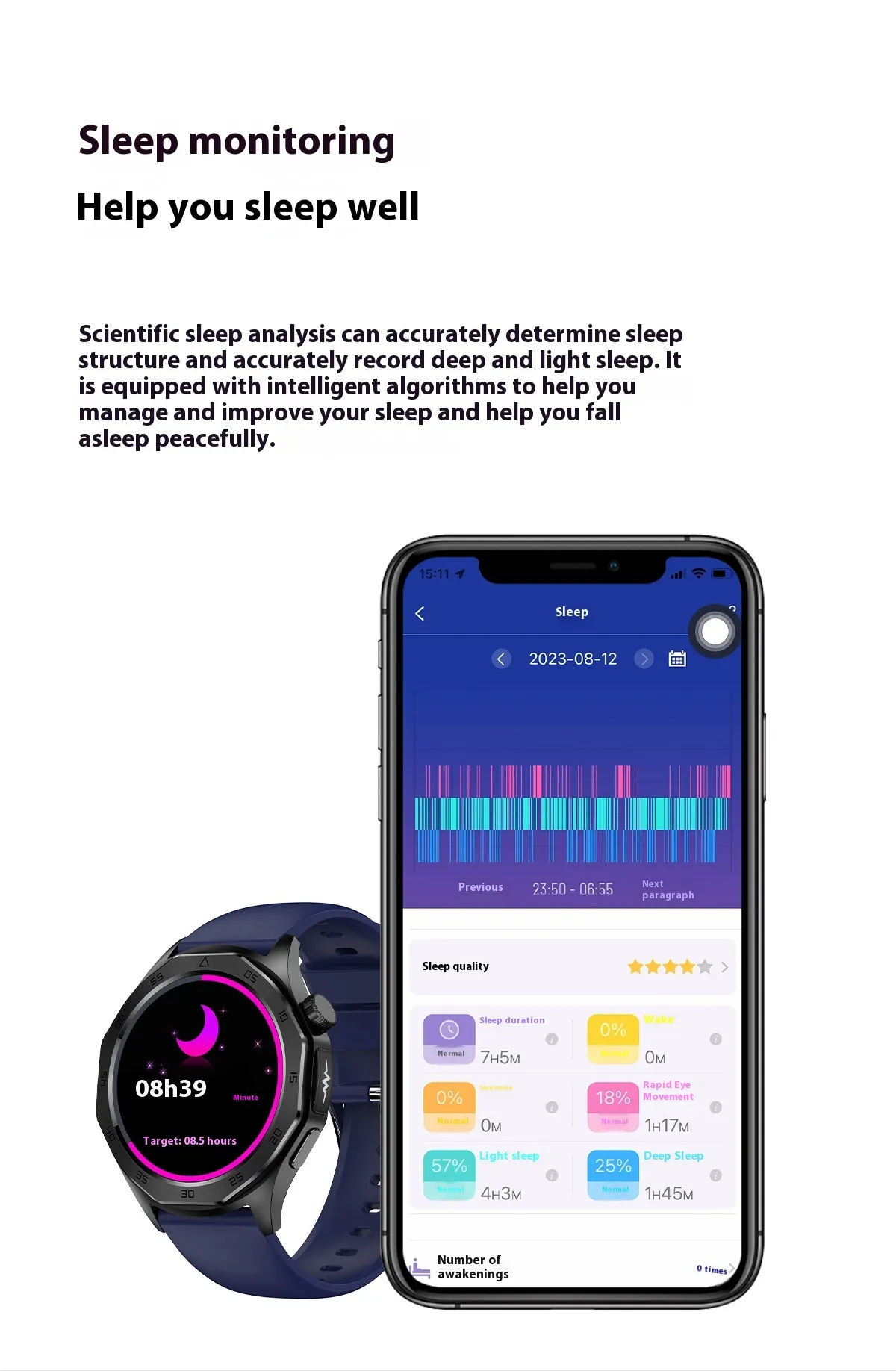 The smartwatch syncs seamlessly with the H Band app, offering a simple, intuitive interface for easy navigation, goal setting, and data syncing. The app ensures that you can manage and review all your health data in one place.