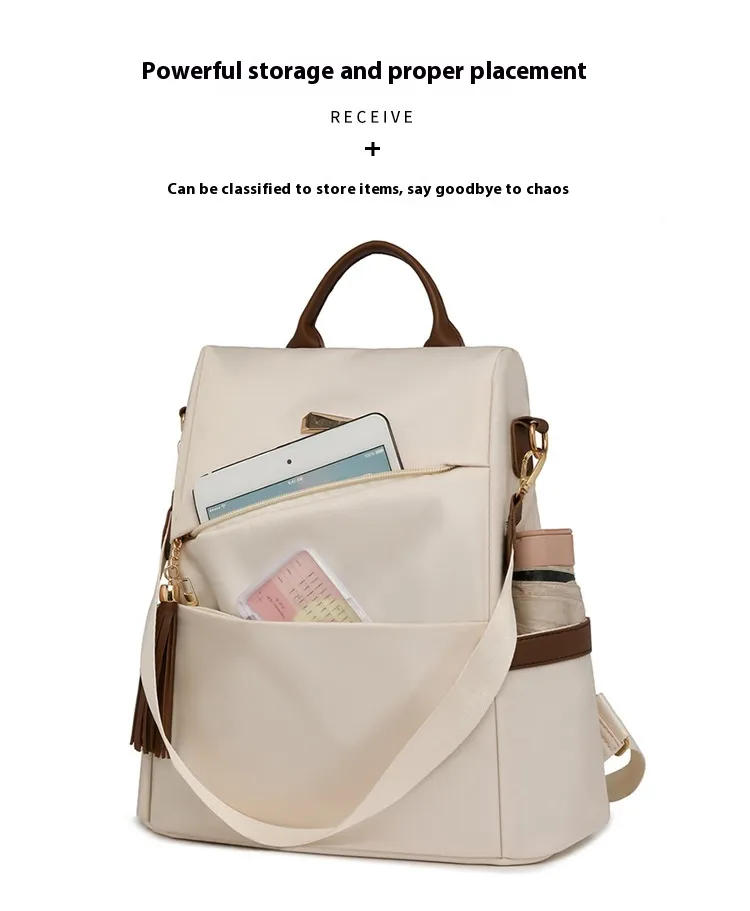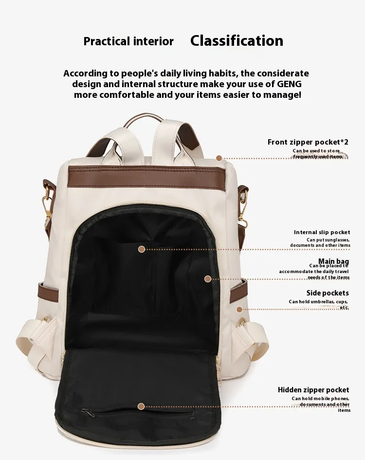 With a large main compartment and additional pockets, this backpack provides ample storage for your essentials, including books, a tablet, wallet, and cosmetics. Its organized layout helps keep everything in its place.