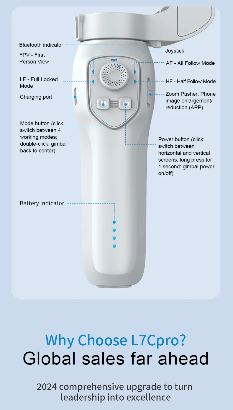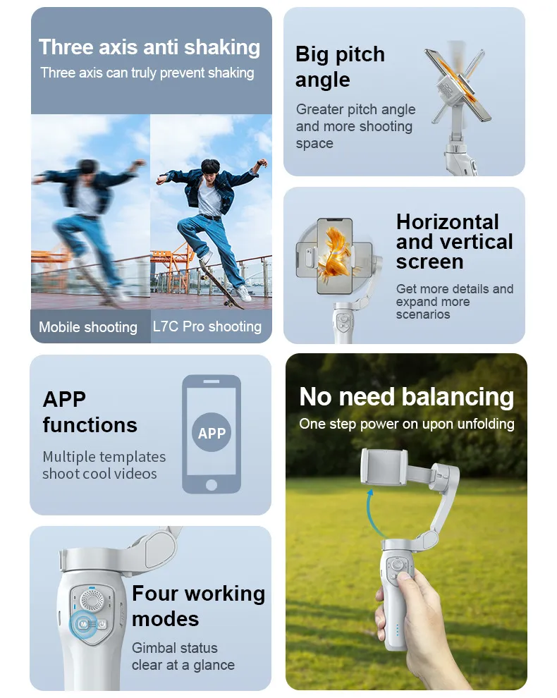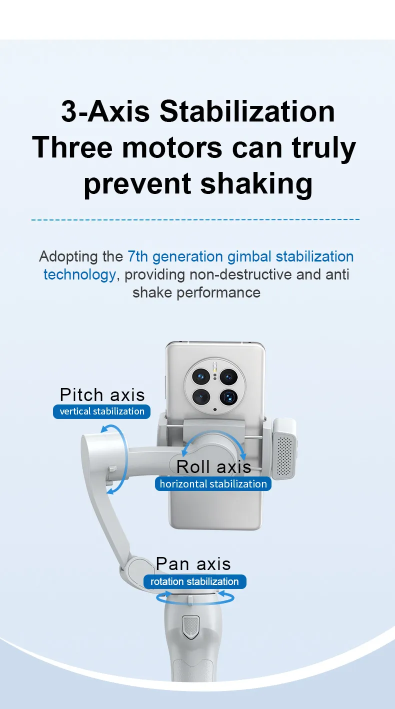 - Smooth, Professional-Quality Footage: The stabilizer uses advanced technology to reduce shakes and jerks, providing smooth, stable footage even in fast-moving situations. Capture professional-grade video whether you're walking, running, or filming at an event.