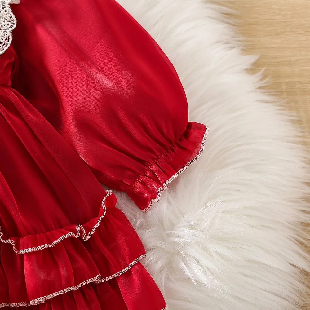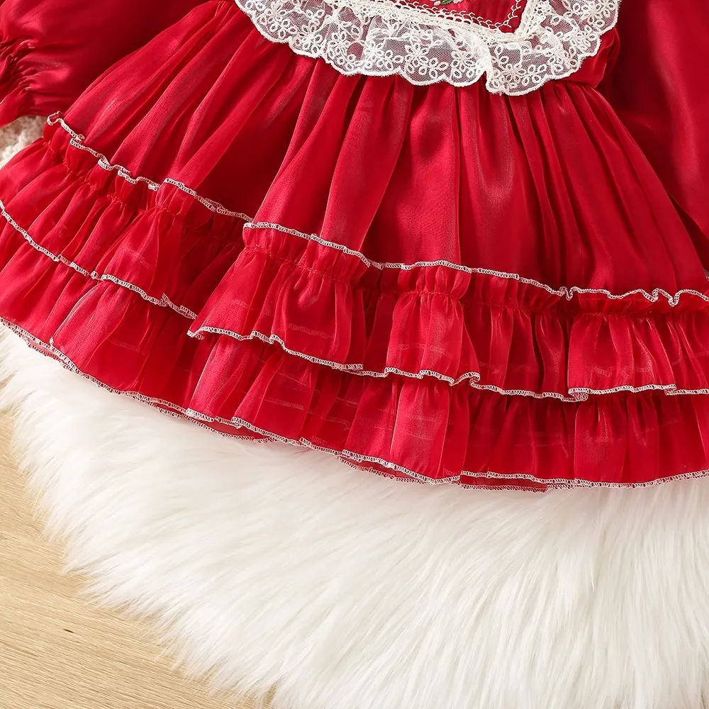 Vintage-Inspired Design: Embraces retro elements with lace trims, puffed sleeves, and a full skirt, reminiscent of classic