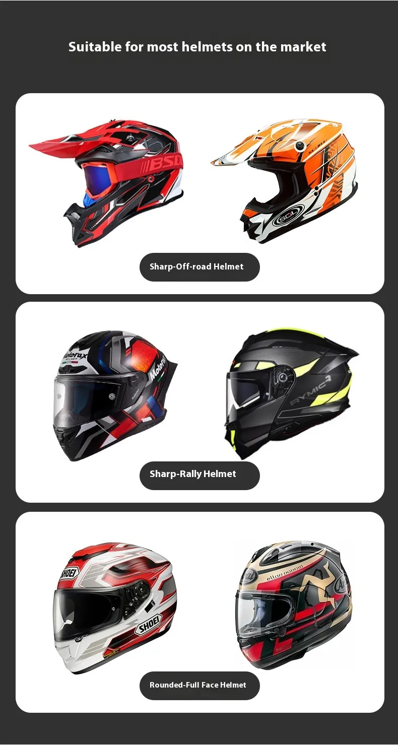 This motorcycle helmet chin camera mount is compatible with most full-face helmets and action cameras, including popular models from GoPro, DJI Osmo, and other similar brands. The included mounting hardware ensures a secure fit for a wide variety of helmet styles.