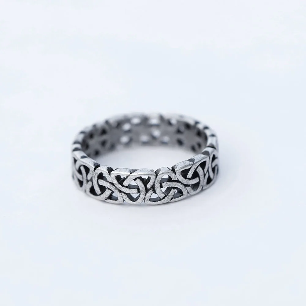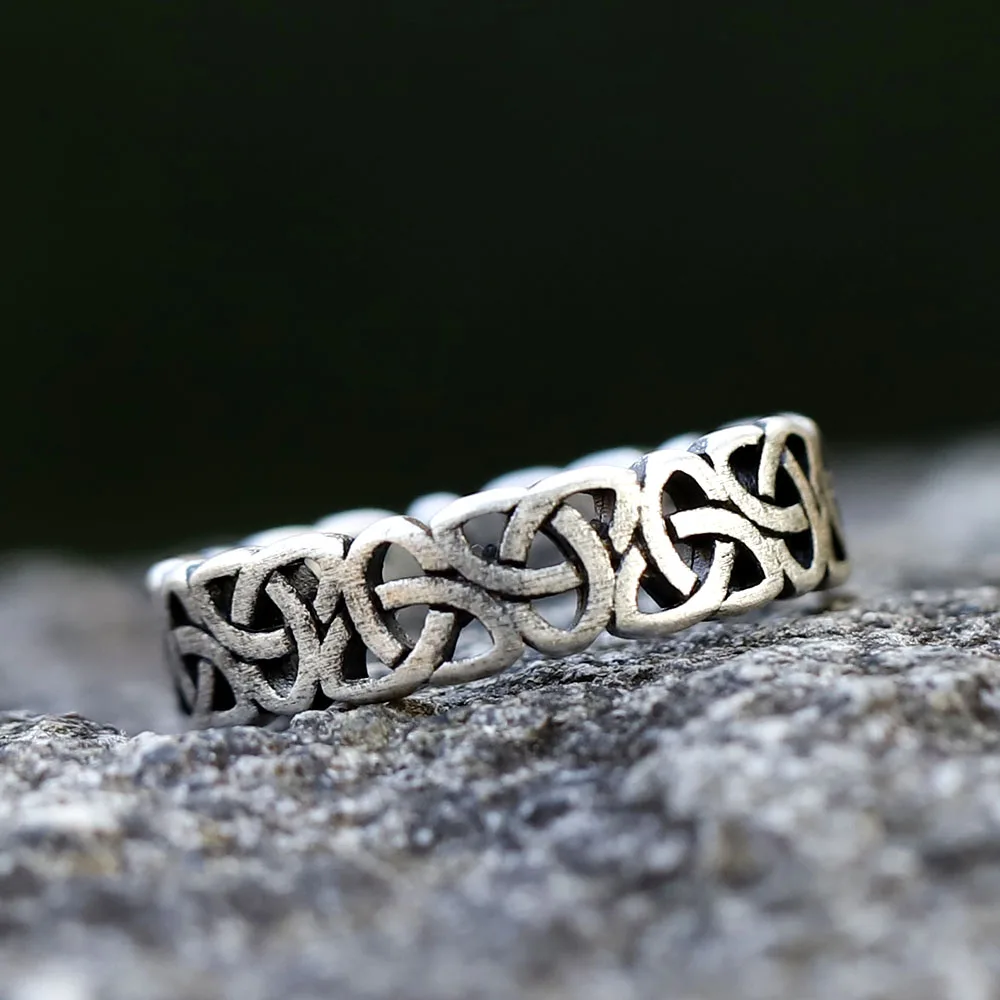 At the heart of this striking ring is the Celtic knot design, a symbol of eternity and interconnectedness in Viking and Celtic traditions. The intricate pattern represents strength, resilience, and the bonds that unite us—perfectly captured in a fashion-forward piece of jewelry.