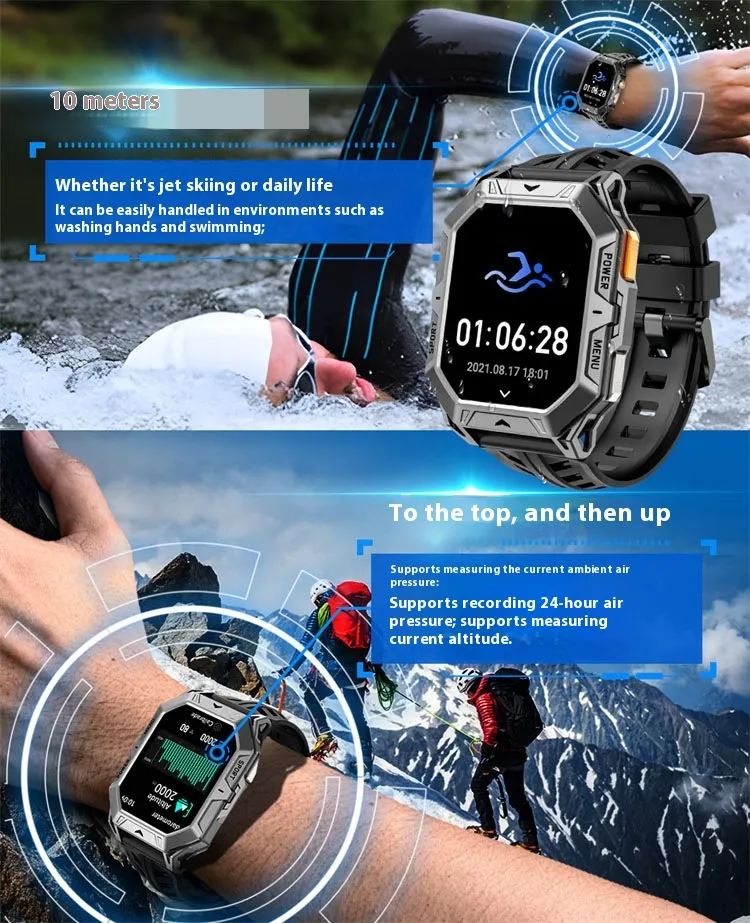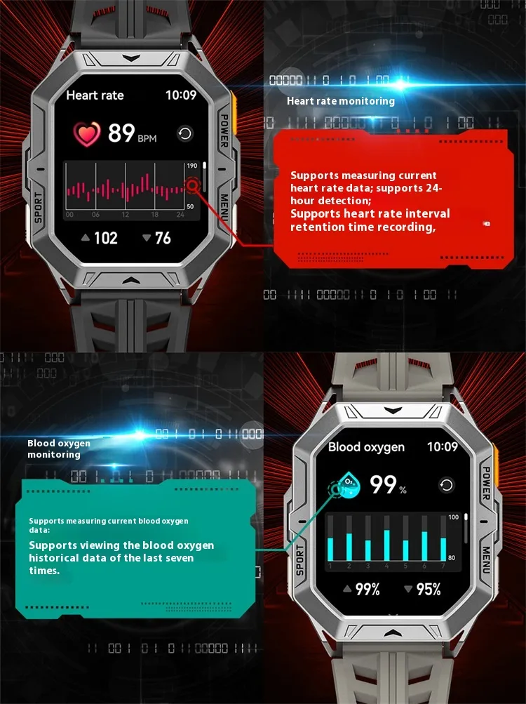 Functions: Waterproof, step counting, heart rate monitoring, blood pressure measurement, social entertainment, Bluetooth calling, smart