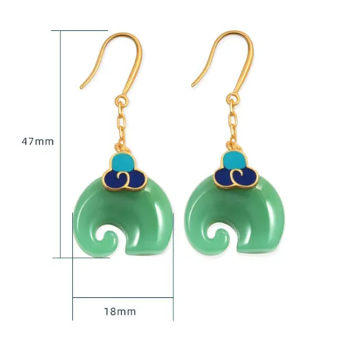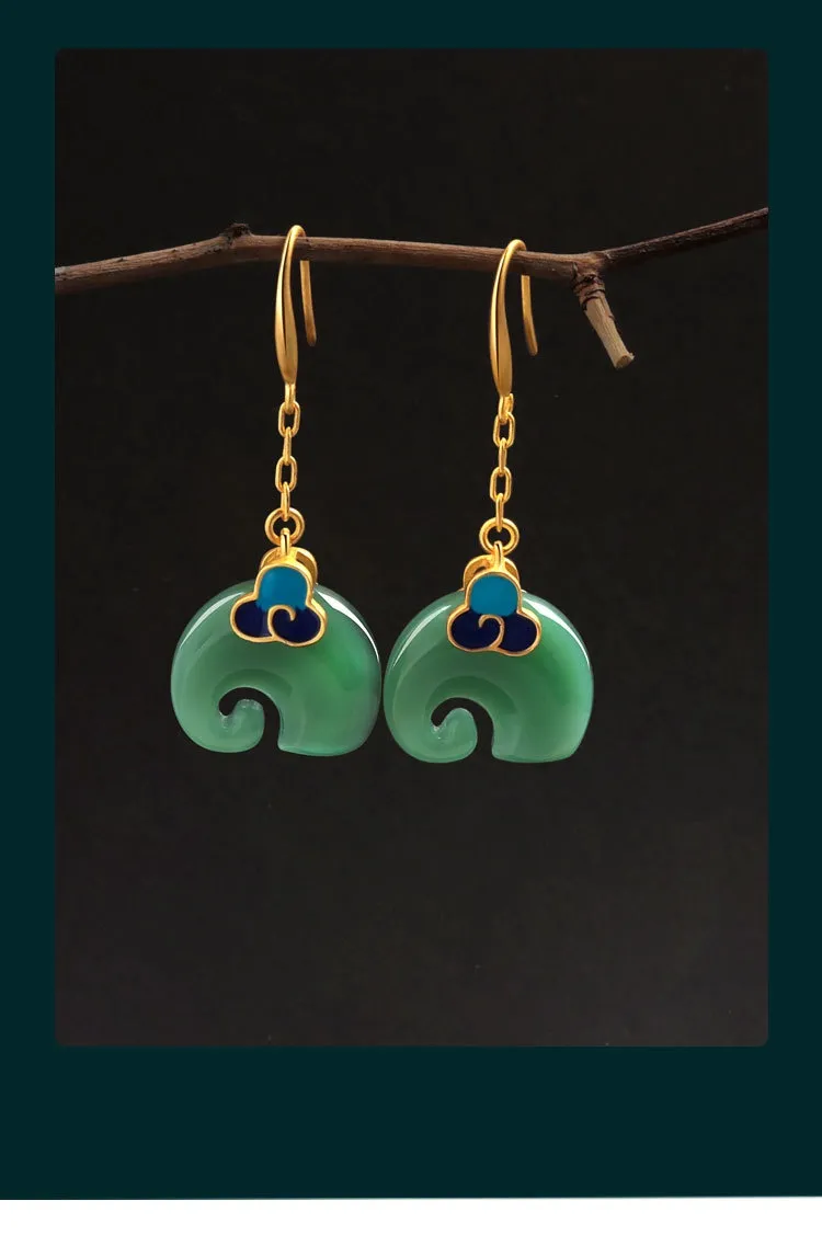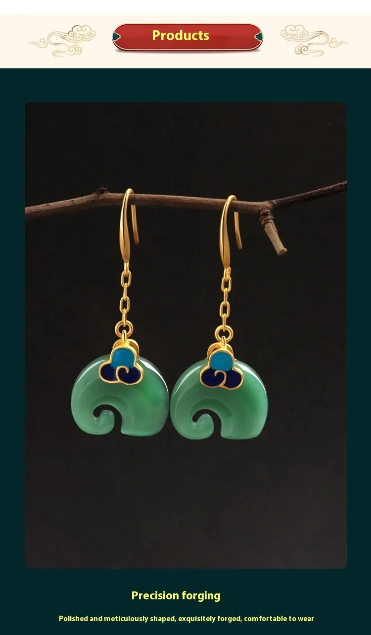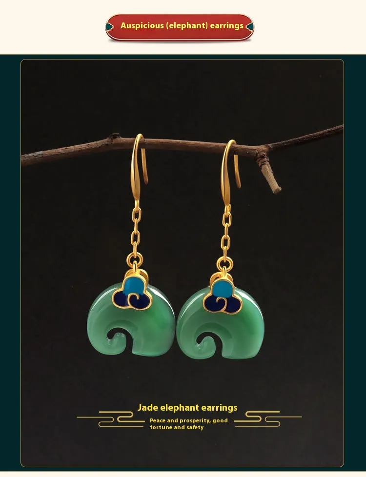 Niche Cold Enamel Xiangyun Elephant Hetian Jade Vintage Style Earrings