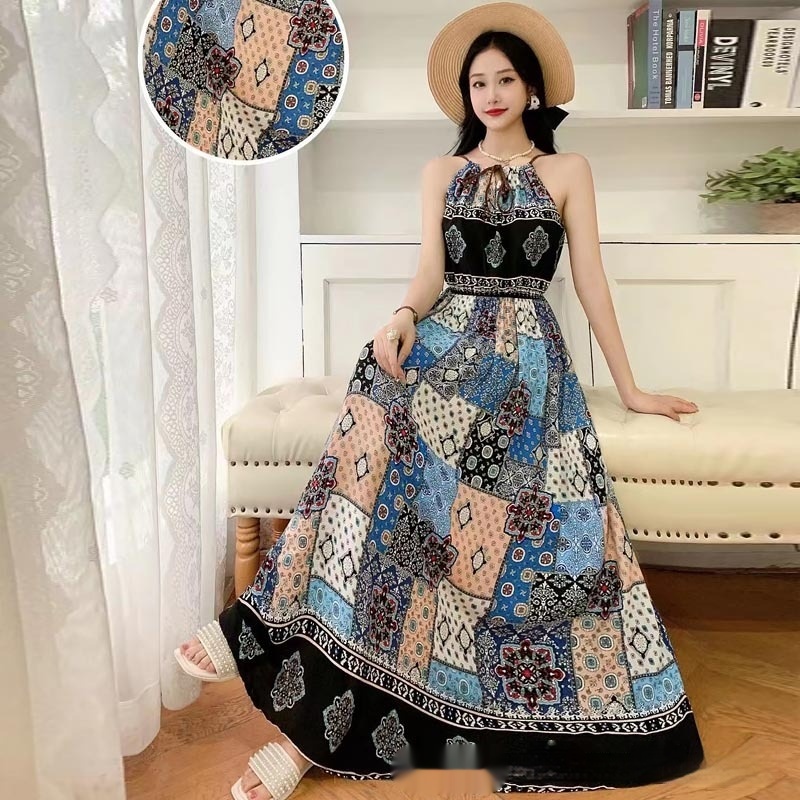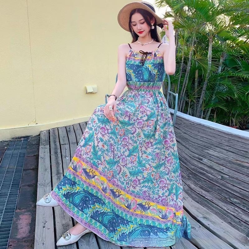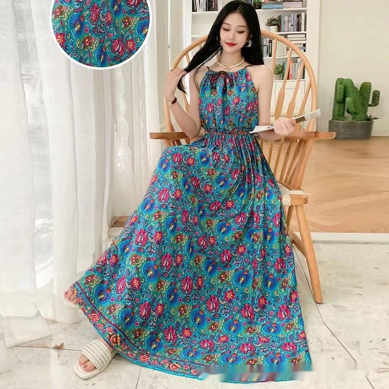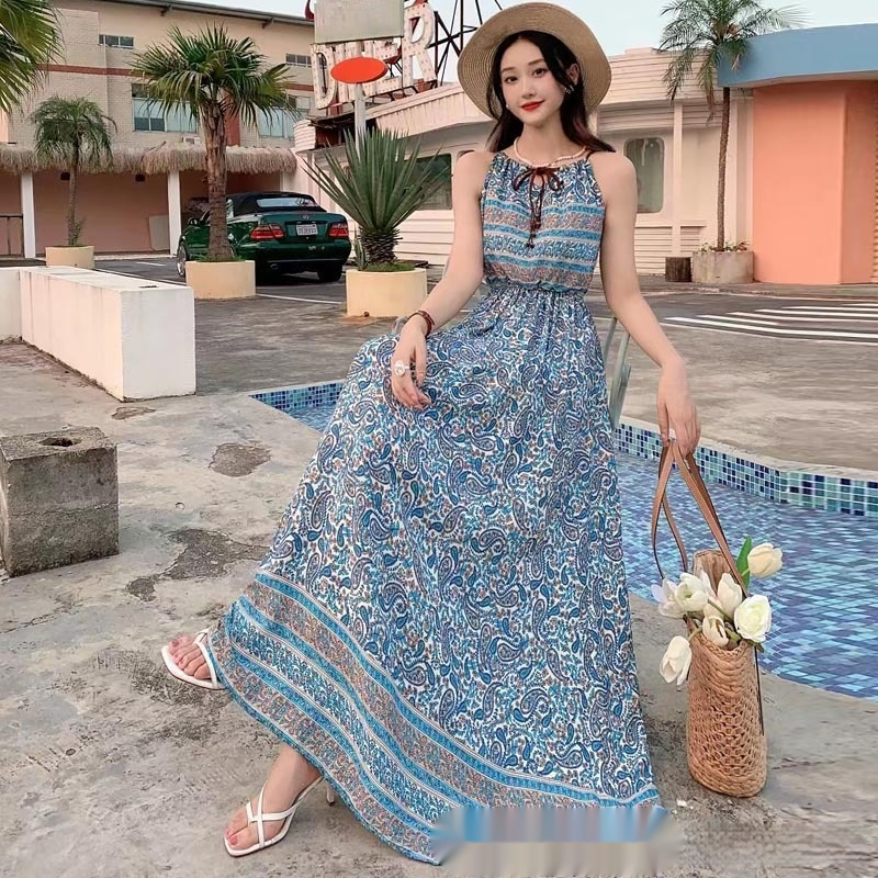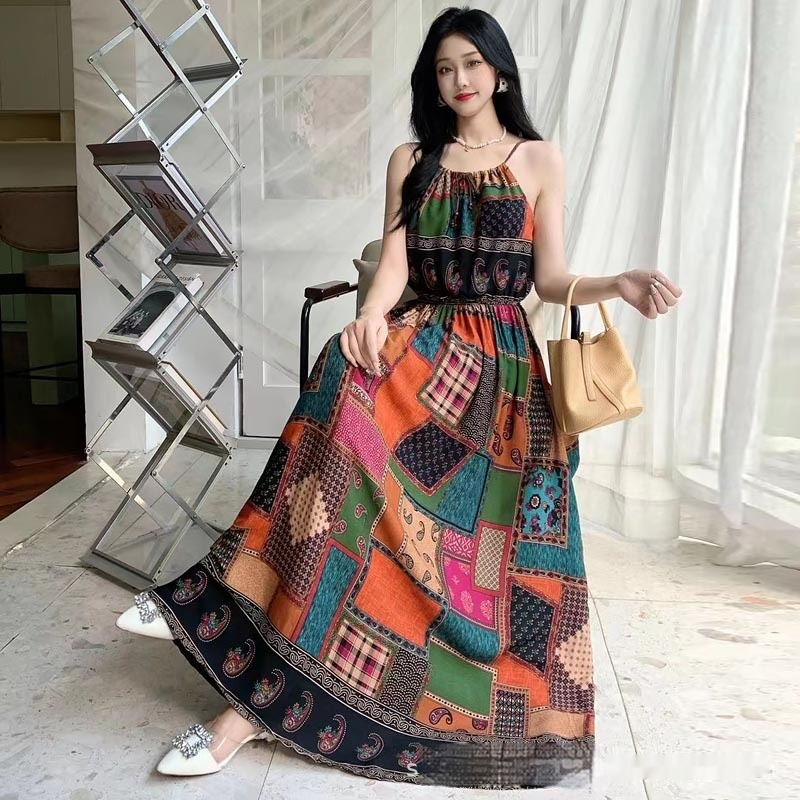 Noil Poplin Dress Large Swing Skirt Vacation Style Suspender Skirt