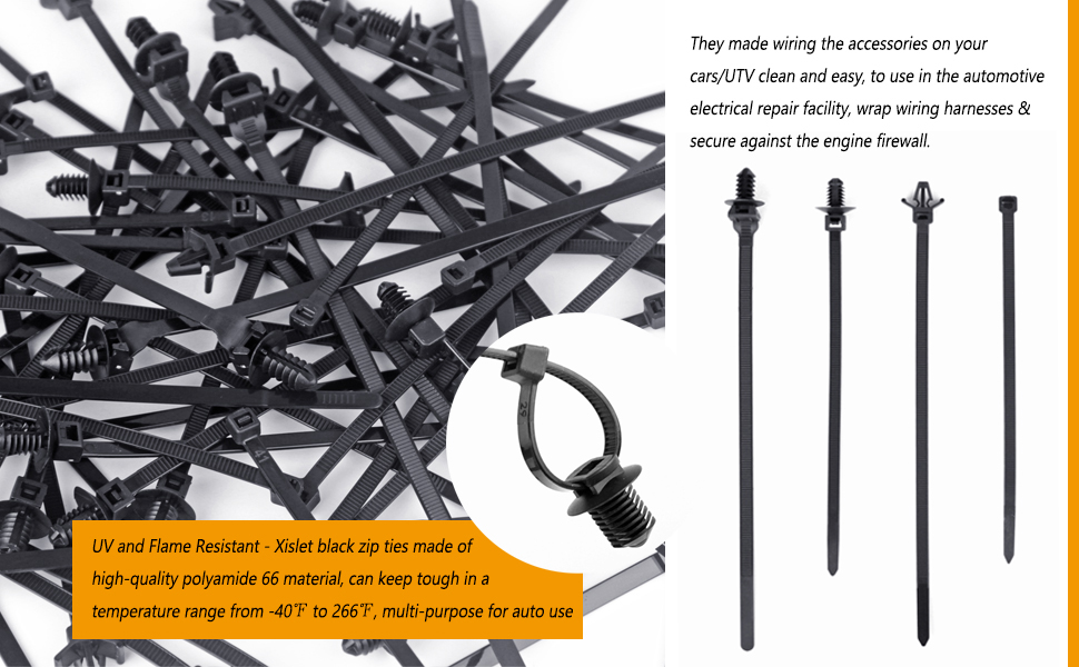 - UV and Flame Resistant - Xislet wire fastener cable clips made of high-quality polyamide 66 material, can keep tough in a temperature range from -40℉ to 266℉, multi-purpose for auto use