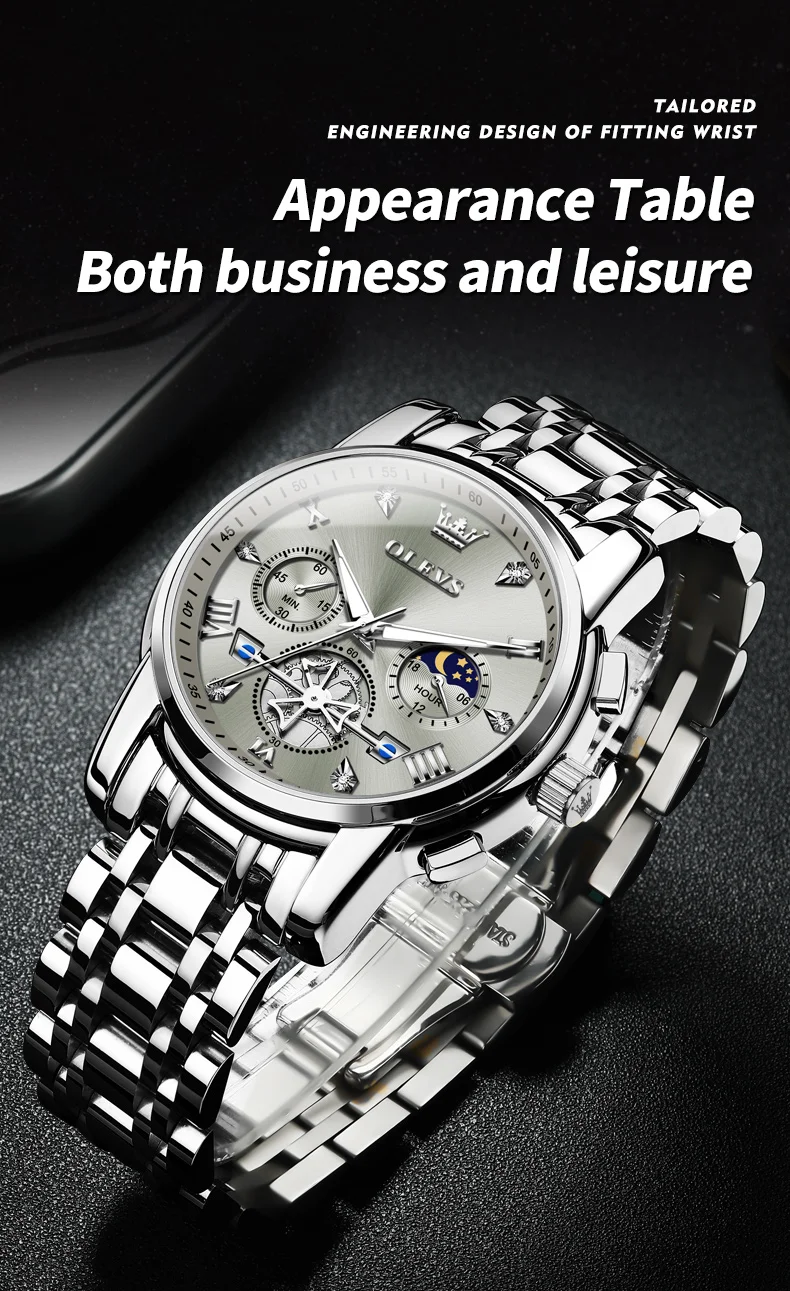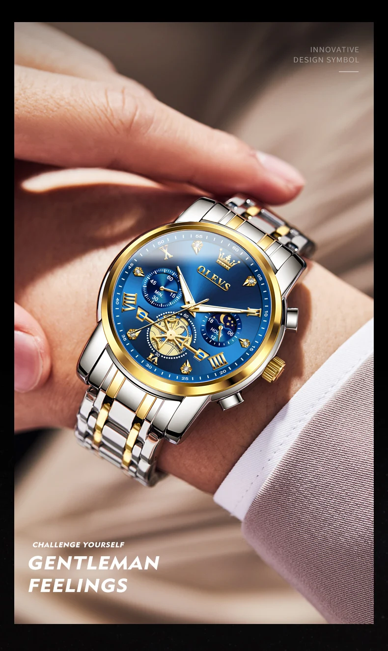 OLEVS Mens Classic Multifunction Quartz Watch Flywheel Chronograph with Moon Phase & 24-Hour Display