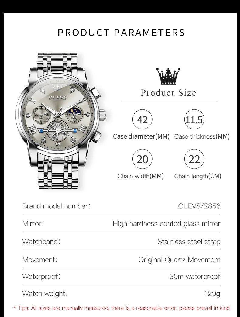 The OLEVS Men’s Classic Quartz Watch combines elegance, durability, and functionality, making it a must-have accessory for any wardrobe. With its flywheel chronograph, moon phase display, and waterproof design, this watch provides a sophisticated look that suits various occasions. Perfect for both daily wear and special events, it’s a timeless piece that enhances any outfit.