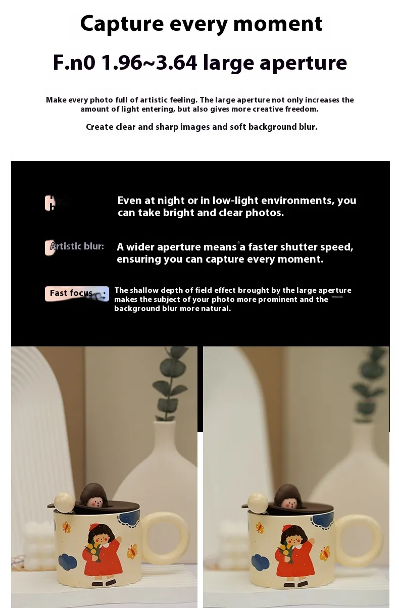 The camera is equipped with an ultra-wide-angle lens, allowing for expansive shots that are perfect for vlogging, group videos, and capturing wide scenes. This feature ensures that you can include more in your frame without the need for additional equipment or complex adjustments.