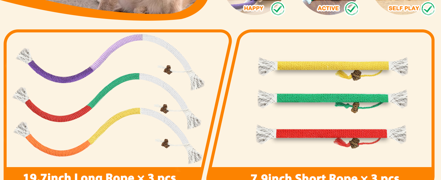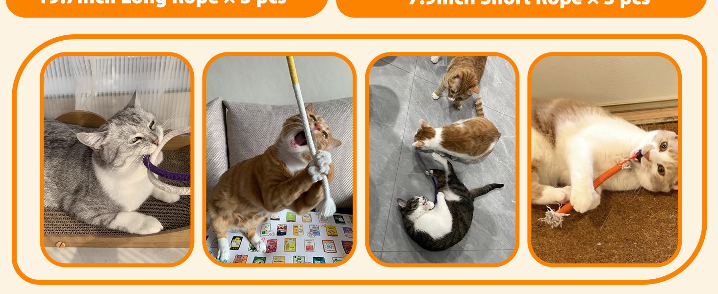 - QUIET PLAY: Including 3pcs 19.7" and 3pcs 7.9" cat chew ropes to meet your cat's multiple needs. These soft colorful cat rope toys provide quiet self play time in the night without bothering cat owner's sleep. Different cats react differently to this cat toy. If your cat doesn't like the cat toys, please contact us for a satisfied solution.