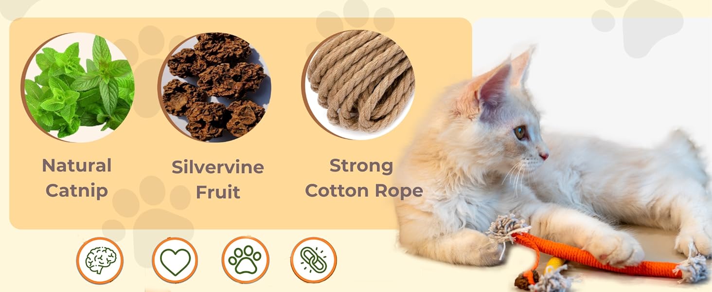 - Promotes Dental Health: As a cat bite rope toy, our teething chew toy helps improve your cat's oral hygiene. The silvervine fruit contains endolipids that aid in digestion and prevent hairballs. Regular play with this toy can contribute to healthier teeth and gums.