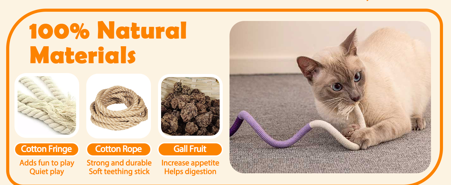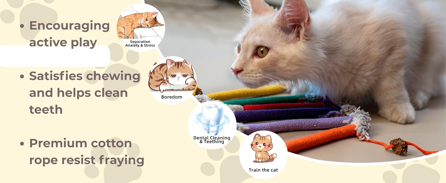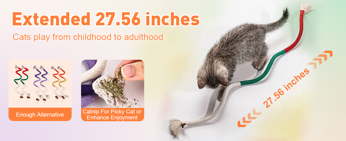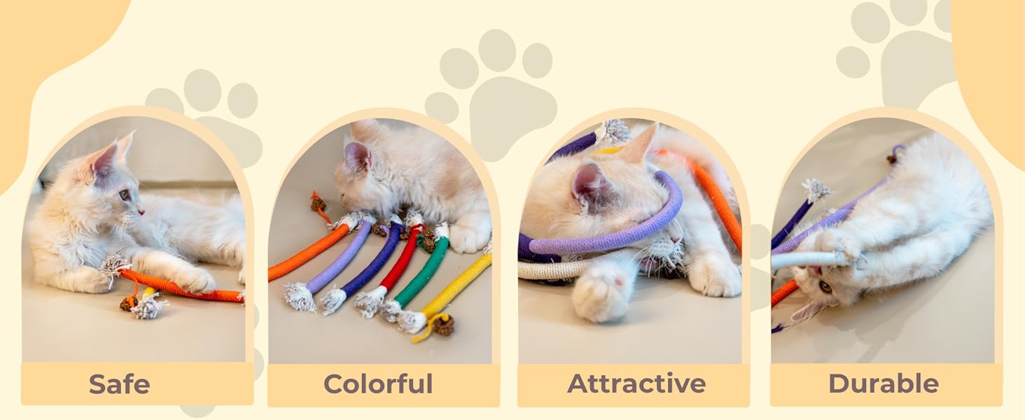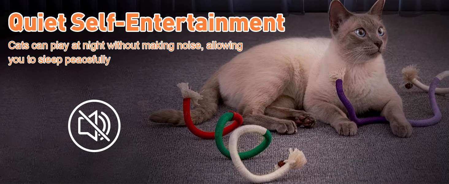 - Quiet Play: These soft colorful ropes provide enriching quiet playtime without bothering cat owner's sleep or life. Your kitty will love the funny snake-like shapes, enhancing their playtime with every pounce and bite.