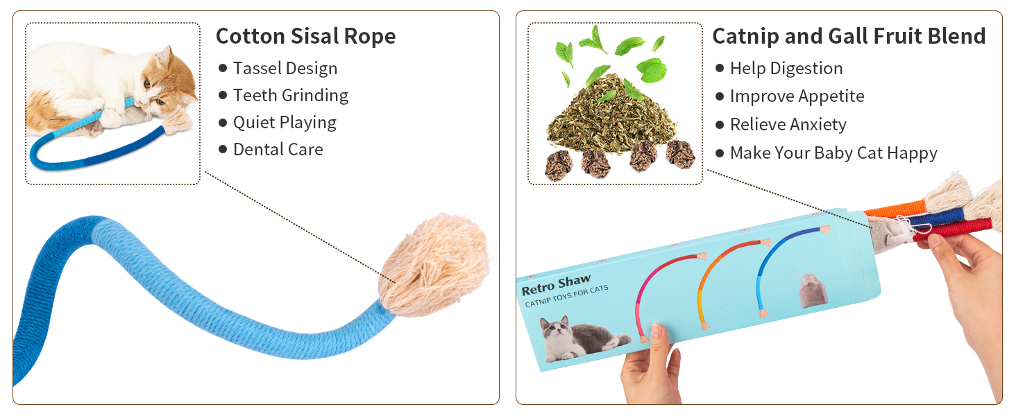 - Quiet Play: These soft colorful ropes provide enriching quiet playtime without bothering cat owner's sleep or life. Your kitty will love the funny snake-like shapes, enhancing their playtime with every pounce and bite.