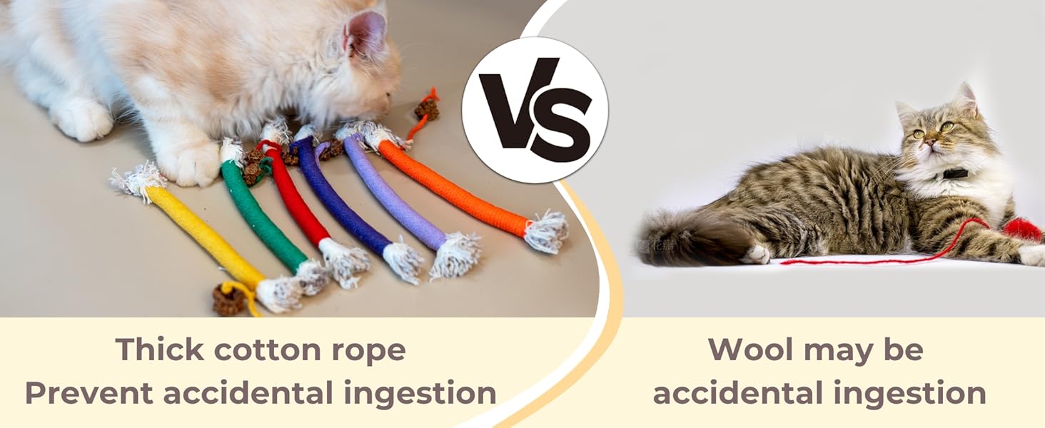 - SAFE CAT CHEW TOY: These cat chew ropes are made of cotton ropes and natural silvervine balls with cotton tassel, no smell and without any metal wire are safe for all cats. The cat rope toys are pretty strong and have withstood your aggressive cat. TIPS: If you are worried that the cat might swallow the small ball, just cut it off.