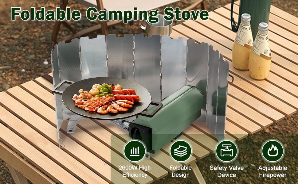 - [2600W High Power] Our folding camping stove has a powerful 2600W fire power, which ensures quick boiling of water and preparation of food. Comes with a wind shield, greatly saving fuel and time